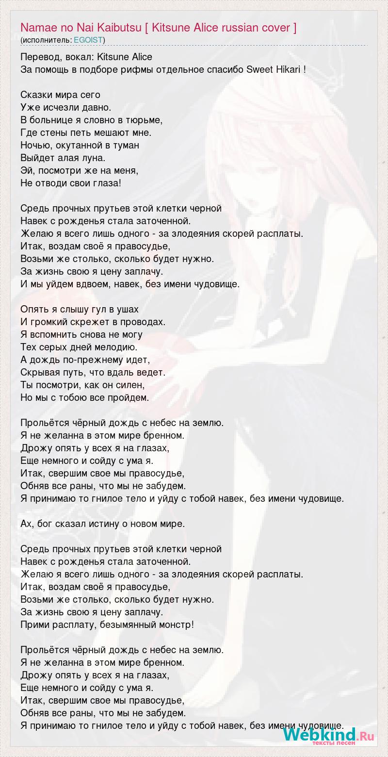 Перевод, вокал: Kitsune Alice За помощь в подборе рифмы отдельное спасибо Sweet Hikari ! Сказки мира сего Уже исчезли давно. В больнице я словно в тюрьме, Где стены петь мешают мне. Ночью, окутанной в туман Выйдет алая луна. Эй, посмотри же на меня, Не отводи свои глаза! Средь прочных прутьев этой клетки черной Навек с рожденья стала заточенной. Желаю я всего лишь одного - за злодеяния скорей расплаты. Итак, воздам своё я правосудье, Возьми же столько, сколько будет нужно. За жизнь свою я цену заплачу. И мы уйдем вдвоем, навек, без имени чудовище. Опять я слышу гул в ушах И громкий скрежет в проводах. Я вспомнить снова не могу Тех серых дней мелодию. А дождь по-прежнему идет, Скрывая путь, что вдаль ведет. Ты посмотри, как он силен, Но мы с тобою все пройдем. Прольётся чёрный дождь с небес на землю. Я не желанна в этом мире бренном. Дрожу опять у всех я на глазах, Еще немного и сойду с ума я. Итак, свершим свое мы правосудье, Обняв все раны, что мы не забудем. Я принимаю то гнилое тело и уйду с тобой навек, без имени чудовище. Ах, бог сказал истину о новом мире. Средь прочных прутьев этой клетки черной Навек с рожденья стала заточенной. Желаю я всего лишь одного - за злодеяния скорей расплаты. Итак, воздам своё я правосудье, Возьми же столько, сколько будет нужно. За жизнь свою я цену заплачу. Прими расплату, безымянный монстр! Прольётся чёрный дождь с небес на землю. Я не желанна в этом мире бренном. Дрожу опять у всех я на глазах, Еще немного и сойду с ума я. Итак, свершим свое мы правосудье, Обняв все раны, что мы не забудем. Я принимаю то гнилое тело и уйду с тобой навек, без имени чудовище.