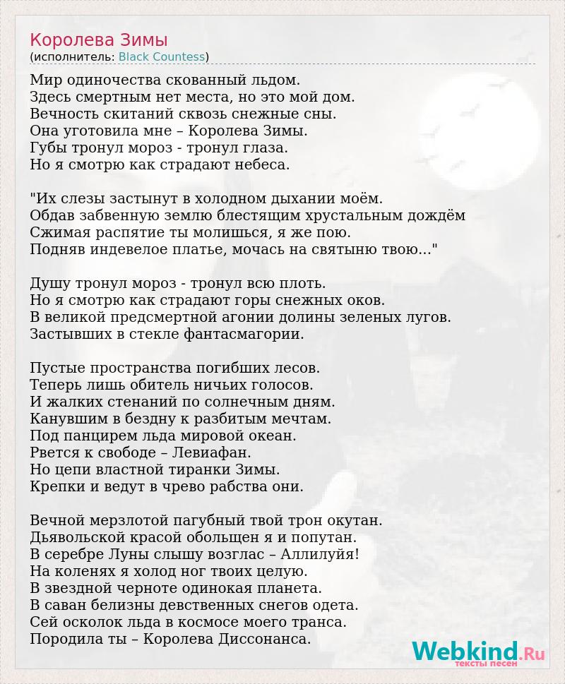 Мир одиночества скованный льдом. Здесь смертным нет места, но это мой дом. Вечность скитаний сквозь снежные сны. Она уготовила мне – Королева Зимы. Губы тронул мороз - тронул глаза. Но я смотрю как страдают небеса. "Их слезы застынут в холодном дыхании моём. Обдав забвенную землю блестящим хрустальным дождём Сжимая распятие ты молишься, я же пою. Подняв индевелое платье, мочась на святыню твою..." Душу тронул мороз - тронул всю плоть. Но я смотрю как страдают горы снежных оков. В великой предсмертной агонии долины зеленых лугов. Застывших в стекле фантасмагории. Пустые пространства погибших лесов. Теперь лишь обитель ничьих голосов. И жалких стенаний по солнечным дням. Канувшим в бездну к разбитым мечтам. Под панцирем льда мировой океан. Рвется к свободе – Левиафан. Но цепи властной тиранки Зимы. Крепки и ведут в чрево рабства они. Вечной мерзлотой пагубный твой трон окутан. Дьявольской красой обольщен я и попутан. В серебре Луны слышу возглас – Аллилуйя! На коленях я холод ног твоих целую. В звездной черноте одинокая планета. В саван белизны девственных снегов одета. Сей осколок льда в космосе моего транса. Породила ты – Королева Диссонанса.
