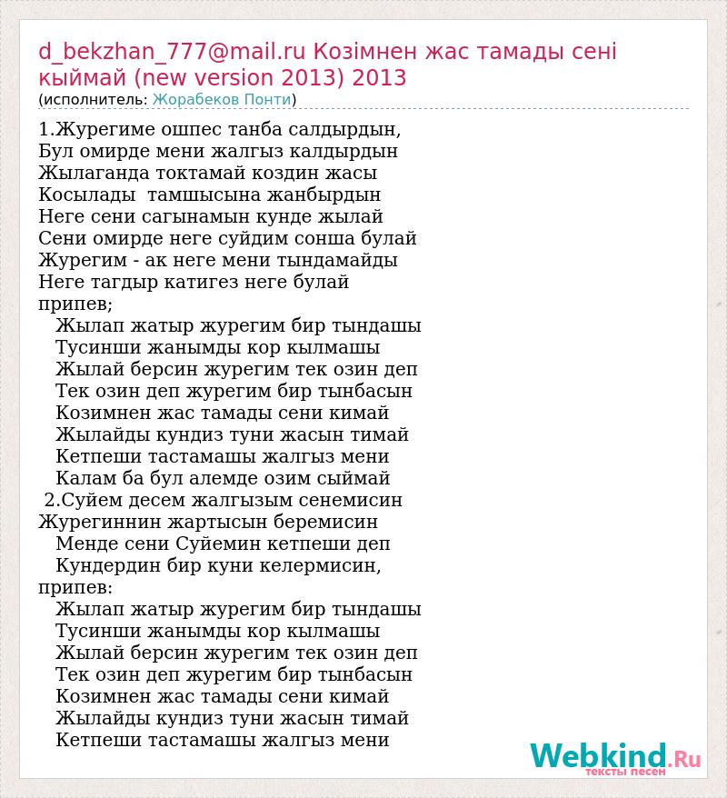 1.Журегиме ошпес танба салдырдын, Бул омирде мени жалгыз калдырдын Жылаганда токтамай коздин жасы Косылады тамшысына жанбырдын Неге сени сагынамын кунде жылай Сени омирде неге суйдим сонша булай Журегим - ак неге мени тындамайды Неге тагдыр катигез неге булай припев; Жылап жатыр журегим бир тындашы Тусинши жанымды кор кылмашы Жылай берсин журегим тек озин деп Тек озин деп журегим бир тынбасын Козимнен жас тамады сени кимай Жылайды кундиз туни жасын тимай Кетпеши тастамашы жалгыз мени Калам ба бул алемде озим сыймай 2.Суйем десем жалгызым сенемисин Журегиннин жартысын беремисин Менде сени Суйемин кетпеши деп Кундердин бир куни келермисин, припев: Жылап жатыр журегим бир тындашы Тусинши жанымды кор кылмашы Жылай берсин журегим тек озин деп Тек озин деп журегим бир тынбасын Козимнен жас тамады сени кимай Жылайды кундиз туни жасын тимай Кетпеши тастамашы жалгыз мени