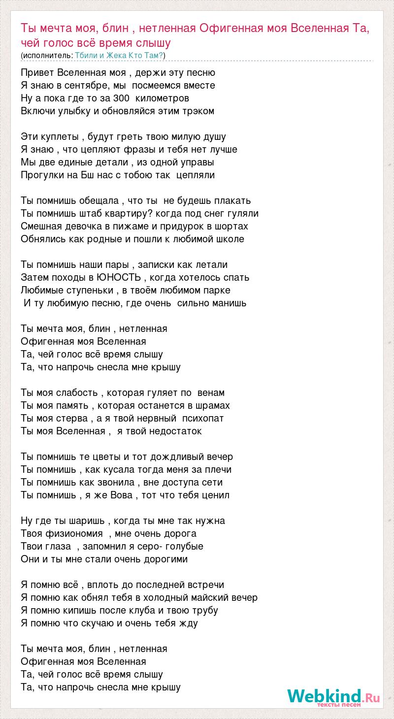 Привет Вселенная моя , держи эту песню Я знаю в сентябре, мы посмеемся вместе Ну а пока где то за 300 километров Включи улыбку и обновляйся этим трэком Эти куплеты , будут греть твою милую душу Я знаю , что цепляют фразы и тебя нет лучше Мы две единые детали , из одной управы Прогулки на Бш нас с тобою так цепляли Ты помнишь обещала , что ты не будешь плакать Ты помнишь штаб квартиру? когда под снег гуляли Смешная девочка в пижаме и придурок в шортах Обнялись как родные и пошли к любимой школе Ты помнишь наши пары , записки как летали Затем походы в ЮНОСТЬ , когда хотелось спать Любимые ступеньки , в твоём любимом парке И ту любимую песню, где очень сильно манишь Ты мечта моя, блин , нетленная Офигенная моя Вселенная Та, чей голос всё время слышу Та, что напрочь снесла мне крышу Ты моя слабость , которая гуляет по венам Ты моя память , которая останется в шрамах Ты моя стерва , а я твой нервный психопат Ты моя Вселенная , я твой недостаток Ты помнишь те цветы и тот дождливый вечер Ты помнишь , как кусала тогда меня за плечи Ты помнишь как звонила , вне доступа сети Ты помнишь , я же Вова , тот что тебя ценил Ну где ты шаришь , когда ты мне так нужна Твоя физиономия , мне очень дорога Твои глаза , запомнил я серо- голубые Они и ты мне стали очень дорогими Я помню всё , вплоть до последней встречи Я помню как обнял тебя в холодный майский вечер Я помню кипишь после клуба и твою трубу Я помню что скучаю и очень тебя жду Ты мечта моя, блин , нетленная Офигенная моя Вселенная Та, чей голос всё время слышу Та, что напрочь снесла мне крышу
