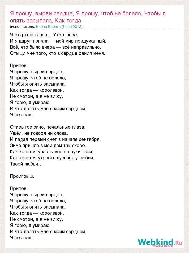 Я открыла глаза… Утро юное. И я вдруг поняла — мой мир придуманный, Всё, что было вчера — всё неправильно, Отыщи мне того, кто в сердце ранил меня. Припев: Я прошу, вырви сердце, Я прошу, чтоб не болело, Чтобы я опять засыпала, Как тогда — королевой. Не смотри, а я не вижу, Я горю, я умираю. И что делать мне с моим сердцем, Я не знаю. Открытое окно, печальные глаза, Ушёл, не говоря ни слова. И падал первый снег в начале сентября, Зима пришла в мой дом так скоро. Как хочется упасть мне на руки твои, Как хочется украсть кусочек у любви, Твоей любви… Проигрыш. Припев: Я прошу, вырви сердце, Я прошу, чтоб не болело, Чтобы я опять засыпала, Как тогда — королевой. Не смотри, а я не вижу, Я горю, я умираю. И что делать мне с моим сердцем, Я не знаю.