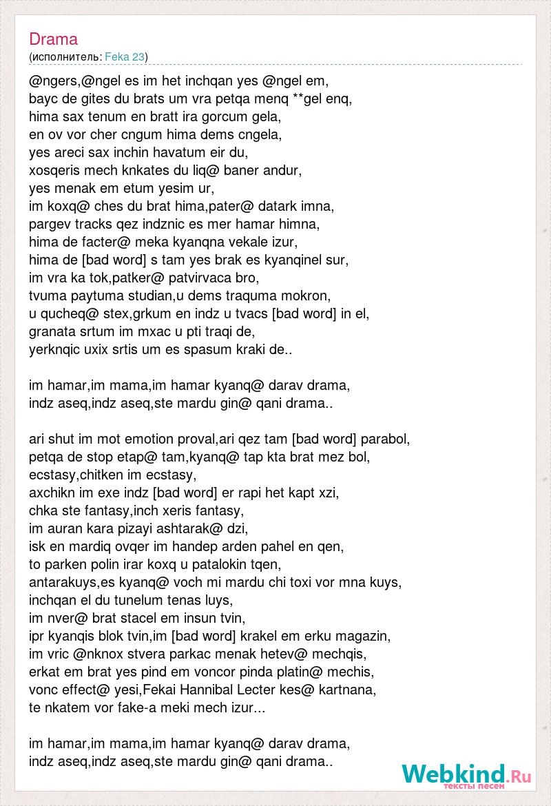 @ngers,@ngel es im het inchqan yes @ngel em, bayc de gites du brats um vra petqa menq **gel enq, hima sax tenum en bratt ira gorcum gela, en ov vor cher cngum hima dems cngela, yes areci sax inchin havatum eir du, xosqeris mech knkates du liq@ baner andur, yes menak em etum yesim ur, im koxq@ ches du brat hima,pater@ datark imna, pargev tracks qez indznic es mer hamar himna, hima de facter@ meka kyanqna vekale izur, hima de [bad word] s tam yes brak es kyanqinel sur, im vra ka tok,patker@ patvirvaca bro, tvuma paytuma studian,u dems traquma mokron, u qucheq@ stex,grkum en indz u tvacs [bad word] in el, granata srtum im mxac u pti traqi de, yerknqic uxix srtis um es spasum kraki de.. im hamar,im mama,im hamar kyanq@ darav drama, indz aseq,indz aseq,ste mardu gin@ qani drama.. ari shut im mot emotion proval,ari qez tam [bad word] parabol, petqa de stop etap@ tam,kyanq@ tap kta brat mez bol, ecstasy,chitken im ecstasy, axchikn im exe indz [bad word] er rapi het kapt xzi, chka ste fantasy,inch xeris fantasy, im auran kara pizayi ashtarak@ dzi, isk en mardiq ovqer im handep arden pahel en qen, to parken polin irar koxq u patalokin tqen, antarakuys,es kyanq@ voch mi mardu chi toxi vor mna kuys, inchqan el du tunelum tenas luys, im nver@ brat stacel em insun tvin, ipr kyanqis blok tvin,im [bad word] krakel em erku magazin, im vric @nknox stvera parkac menak hetev@ mechqis, erkat em brat yes pind em voncor pinda platin@ mechis, vonc effect@ yesi,Fekai Hannibal Lecter kes@ kartnana, te nkatem vor fake-a meki mech izur... im hamar,im mama,im hamar kyanq@ darav drama, indz aseq,indz aseq,ste mardu gin@ qani drama..