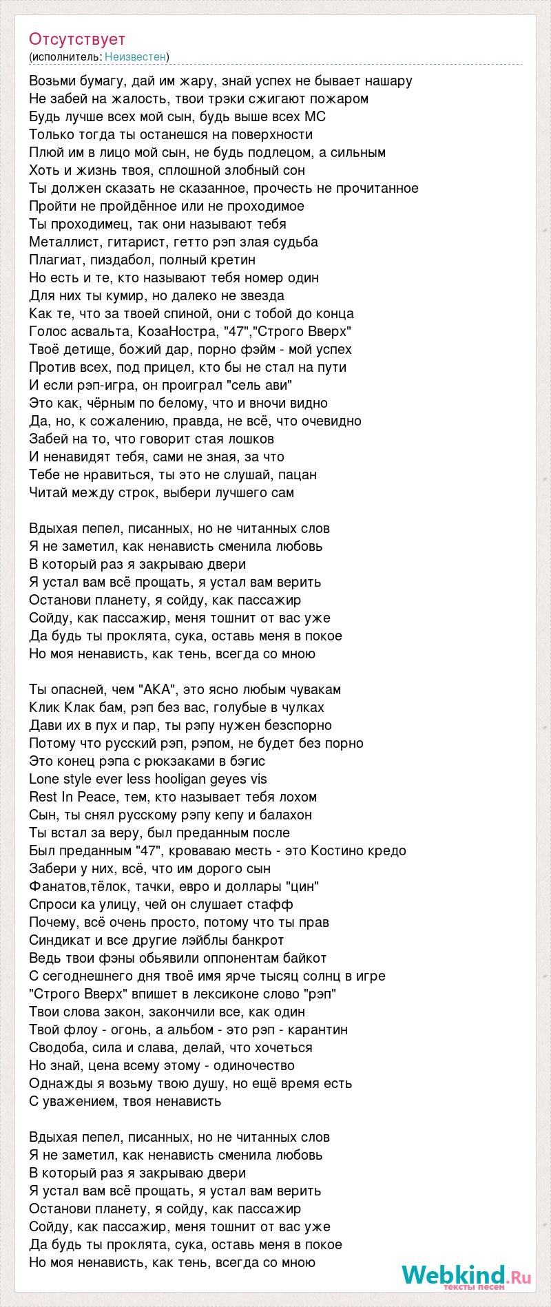 Возьми бумагу, дай им жару, знай успех не бывает нашару Не забей на жалость, твои трэки сжигают пожаром Будь лучше всех мой сын, будь выше всех МС Только тогда ты останешся на поверхности Плюй им в лицо мой сын, не будь подлецом, а сильным Хоть и жизнь твоя, сплошной злобный сон Ты должен сказать не сказанное, прочесть не прочитанное Пройти не пройдённое или не проходимое Ты проходимец, так они называют тебя Металлист, гитарист, гетто рэп злая судьба Плагиат, пиздабол, полный кретин Но есть и те, кто называют тебя номер один Для них ты кумир, но далеко не звезда Как те, что за твоей спиной, они с тобой до конца Голос асвальта, КозаНостра, "47","Строго Вверх" Твоё детище, божий дар, порно фэйм - мой успех Против всех, под прицел, кто бы не стал на пути И если рэп-игра, он проиграл "сель ави" Это как, чёрным по белому, что и вночи видно Да, но, к сожалению, правда, не всё, что очевидно Забей на то, что говорит стая лошков И ненавидят тебя, сами не зная, за что Тебе не нравиться, ты это не слушай, пацан Читай между строк, выбери лучшего сам Вдыхая пепел, писанных, но не читанных слов Я не заметил, как ненависть сменила любовь В который раз я закрываю двери Я устал вам всё прощать, я устал вам верить Останови планету, я сойду, как пассажир Сойду, как пассажир, меня тошнит от вас уже Да будь ты проклята, сука, оставь меня в покое Но моя ненависть, как тень, всегда со мною Ты опасней, чем "АКА", это ясно любым чувакам Клик Клак бам, рэп без вас, голубые в чулках Дави их в пух и пар, ты рэпу нужен безспорно Потому что русский рэп, рэпом, не будет без порно Это конец рэпа с рюкзаками в бэгис Lone style ever less hooligan geyes vis Rest In Peace, тем, кто называет тебя лохом Сын, ты снял русскому рэпу кепу и балахон Ты встал за веру, был преданным после Был преданным "47", кроваваю месть - это Костино кредо Забери у них, всё, что им дорого сын Фанатов,тёлок, тачки, евро и доллары "цин" Спроси ка улицу, чей он слушает стафф Почему, всё очень просто, потому что ты прав Синдикат и все другие лэйблы банкрот Ведь твои фэны обьявили оппонентам байкот С сегоднешнего дня твоё имя ярче тысяц солнц в игре "Строго Вверх" впишет в лексиконе слово "рэп" Твои слова закон, закончили все, как один Твой флоу - огонь, а альбом - это рэп - карантин Сводоба, сила и слава, делай, что хочеться Но знай, цена всему этому - одиночество Однажды я возьму твою душу, но ещё время есть С уважением, твоя ненависть Вдыхая пепел, писанных, но не читанных слов Я не заметил, как ненависть сменила любовь В который раз я закрываю двери Я устал вам всё прощать, я устал вам верить Останови планету, я сойду, как пассажир Сойду, как пассажир, меня тошнит от вас уже Да будь ты проклята, сука, оставь меня в покое Но моя ненависть, как тень, всегда со мною