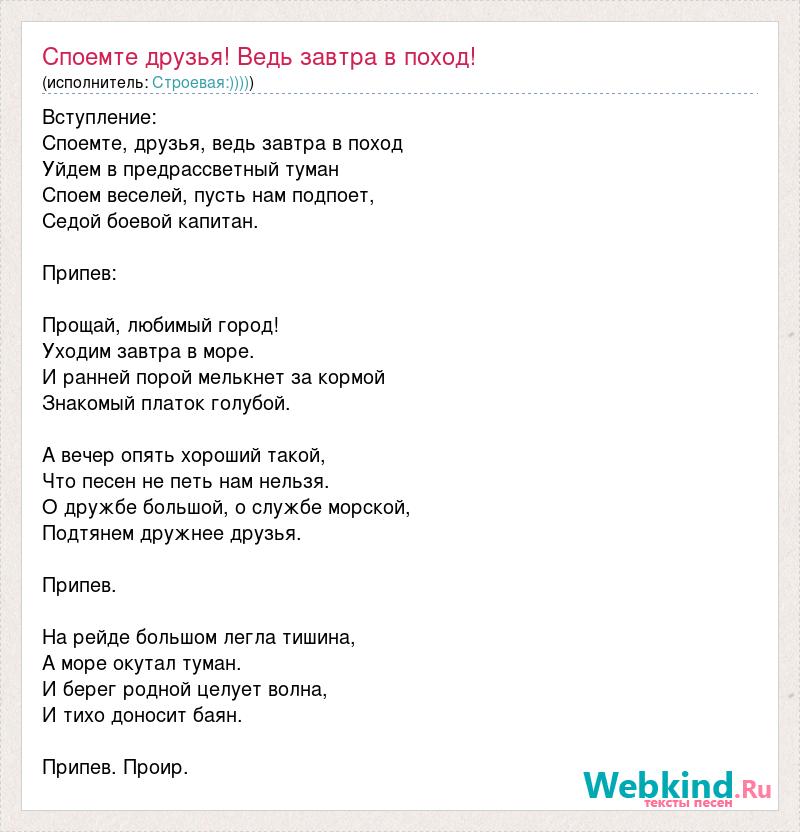 Вступление: Споемте, друзья, ведь завтра в поход Уйдем в предрассветный туман Споем веселей, пусть нам подпоет, Седой боевой капитан. Припев: Прощай, любимый город! Уходим завтра в море. И ранней порой мелькнет за кормой Знакомый платок голубой. А вечер опять хороший такой, Что песен не петь нам нельзя. О дружбе большой, о службе морской, Подтянем дружнее друзья. Припев. На рейде большом легла тишина, А море окутал туман. И берег родной целует волна, И тихо доносит баян. Припев. Проир.