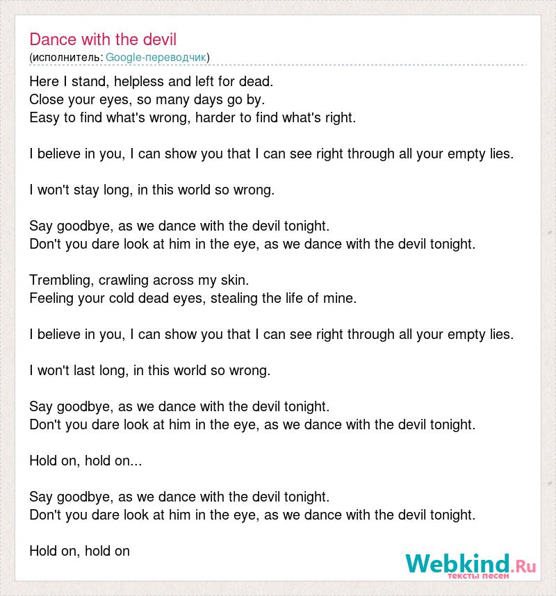 Here I stand, helpless and left for dead. Close your eyes, so many days go by. Easy to find what's wrong, harder to find what's right. I believe in you, I can show you that I can see right through all your empty lies. I won't stay long, in this world so wrong. Say goodbye, as we dance with the devil tonight. Don't you dare look at him in the eye, as we dance with the devil tonight. Trembling, crawling across my skin. Feeling your cold dead eyes, stealing the life of mine. I believe in you, I can show you that I can see right through all your empty lies. I won't last long, in this world so wrong. Say goodbye, as we dance with the devil tonight. Don't you dare look at him in the eye, as we dance with the devil tonight. Hold on, hold on... Say goodbye, as we dance with the devil tonight. Don't you dare look at him in the eye, as we dance with the devil tonight. Hold on, hold on