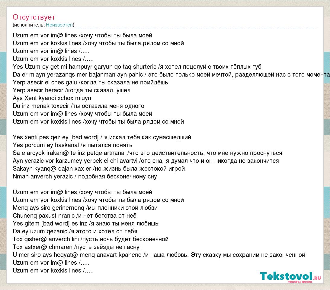 Uzum em vor im@ lines /хочу чтобы ты была моей Uzum em vor koxkis lines /хочу чтобы ты была рядом со мной Uzum em vor im@ lines /..... Uzum em vor koxkis lines /..... Yes Uzum ey get mi hampuyr garyun qo taq shurteric /я хотел поцелуй с твоих тёплых губ Da er miayn yerazanqs mer bajanman ayn pahic / это было только моей мечтой, разделяющей нас с того момента Yerp asecir el ches galu /когда ты сказала не прийдёшь Yerp asecir heracir /когда ты сказал, ушёл Ays Xent kyanqi xchox miuyn Du inz menak toxecir /ты оставила меня одного Uzum em vor im@ lines /хочу чтобы ты была моей Uzum em vor koxkis lines /хочу чтобы ты была рядом со мной Yes xenti pes qez ey pntrum / я искал тебя как сумасшедший Yes porcum ey haskanal /я пытался понять Sa e arcyok irakan@ te inz petqe artnanal /что это действительность, что мне нужно проснуться Ayn yerazic vor karzumey yerpek el chi avartvi /ото сна, я думал что и он никогда не закончится Sakayn kyanq@ dajan xax er /но жизнь была жестокой игрой Nman anverch yerazic / подобная бесконечному сну Uzum em vor im@ lines /хочу чтобы ты была моей Uzum em vor koxkis lines /хочу чтобы ты была рядом со мной Menq ays siro gerinernenq /мы пленники этой любви Chunenq paxust nranic /и нет бегства от неё Yes gitem sirum es inz /я знаю ты меня любишь Da ey uzum qezanic /я этого и хотел от тебя Tox gisher@ anverch lini /пусть ночь будет бесконечной Tox astxer@ chmaren /пусть звёзды не гаснут U mer siro ays heqyat@ menq anavart kpahenq /и наша любовь. Эту сказку мы сохраним не законченной Uzum em vor im@ lines /..... Uzum em vor koxkis lines /.....