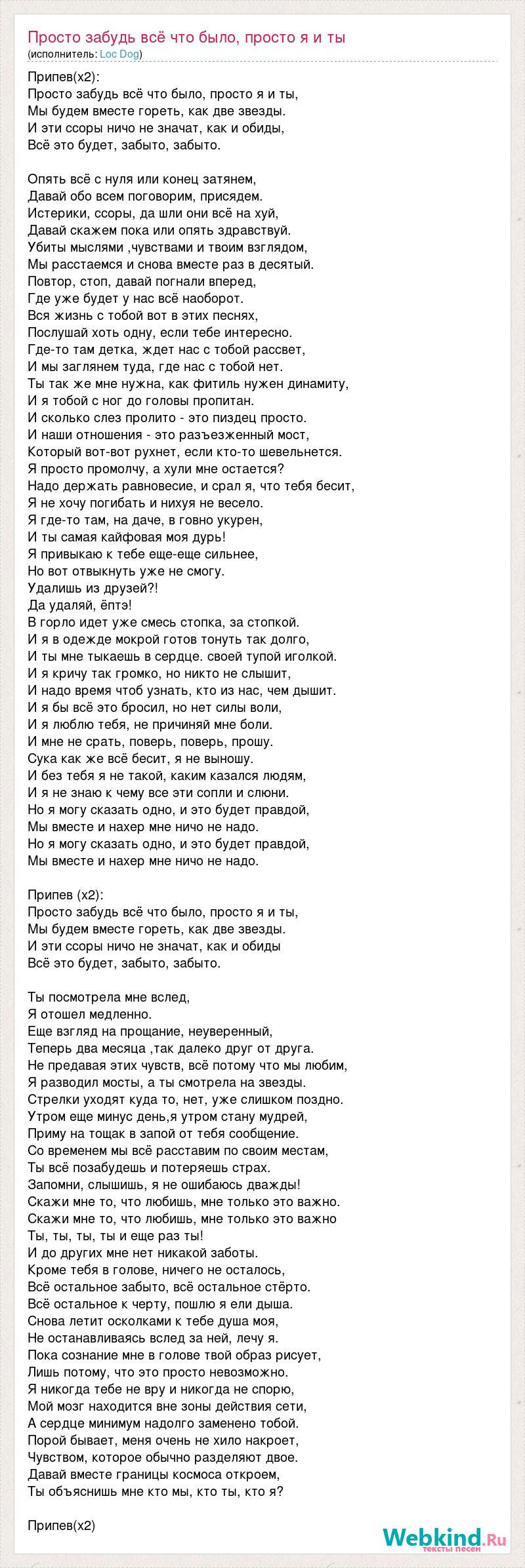 Припев(х2): Просто забудь всё что было, просто я и ты, Мы будем вместе гореть, как две звезды. И эти ссоры ничо не значат, как и обиды, Всё это будет, забыто, забыто. Опять всё с нуля или конец затянем, Давай обо всем поговорим, присядем. Истерики, ссоры, да шли они всё на хуй, Давай скажем пока или опять здравствуй. Убиты мыслями ,чувствами и твоим взглядом, Мы расстаемся и снова вместе раз в десятый. Повтор, стоп, давай погнали вперед, Где уже будет у нас всё наоборот. Вся жизнь с тобой вот в этих песнях, Послушай хоть одну, если тебе интересно. Где-то там детка, ждет нас с тобой рассвет, И мы заглянем туда, где нас с тобой нет. Ты так же мне нужна, как фитиль нужен динамиту, И я тобой с ног до головы пропитан. И сколько слез пролито - это пиздец просто. И наши отношения - это разъезженный мост, Который вот-вот рухнет, если кто-то шевельнется. Я просто промолчу, а хули мне остается? Надо держать равновесие, и срал я, что тебя бесит, Я не хочу погибать и нихуя не весело. Я где-то там, на даче, в говно укурен, И ты самая кайфовая моя дурь! Я привыкаю к тебе еще-еще сильнее, Но вот отвыкнуть уже не смогу. Удалишь из друзей?! Да удаляй, ёптэ! В горло идет уже смесь стопка, за стопкой. И я в одежде мокрой готов тонуть так долго, И ты мне тыкаешь в сердце. своей тупой иголкой. И я кричу так громко, но никто не слышит, И надо время чтоб узнать, кто из нас, чем дышит. И я бы всё это бросил, но нет силы воли, И я люблю тебя, не причиняй мне боли. И мне не срать, поверь, поверь, прошу. Сука как же всё бесит, я не выношу. И без тебя я не такой, каким казался людям, И я не знаю к чему все эти сопли и слюни. Но я могу сказать одно, и это будет правдой, Мы вместе и нахер мне ничо не надо. Но я могу сказать одно, и это будет правдой, Мы вместе и нахер мне ничо не надо. Припев (х2): Просто забудь всё что было, просто я и ты, Мы будем вместе гореть, как две звезды. И эти ссоры ничо не значат, как и обиды Всё это будет, забыто, забыто. Ты посмотрела мне вслед, Я отошел медленно. Еще взгляд на прощание, неуверенный, Теперь два месяца ,так далеко друг от друга. Не предавая этих чувств, всё потому что мы любим, Я разводил мосты, а ты смотрела на звезды. Стрелки уходят куда то, нет, уже слишком поздно. Утром еще минус день,я утром стану мудрей, Приму на тощак в запой от тебя сообщение. Со временем мы всё расставим по своим местам, Ты всё позабудешь и потеряешь страх. Запомни, слышишь, я не ошибаюсь дважды! Скажи мне то, что любишь, мне только это важно. Скажи мне то, что любишь, мне только это важно Ты, ты, ты, ты и еще раз ты! И до других мне нет никакой заботы. Кроме тебя в голове, ничего не осталось, Всё остальное забыто, всё остальное стёрто. Всё остальное к черту, пошлю я ели дыша. Снова летит осколками к тебе душа моя, Не останавливаясь вслед за ней, лечу я. Пока сознание мне в голове твой образ рисует, Лишь потому, что это просто невозможно. Я никогда тебе не вру и никогда не спорю, Мой мозг находится вне зоны действия сети, А сердце минимум надолго заменено тобой. Порой бывает, меня очень не хило накроет, Чувством, которое обычно разделяют двое. Давай вместе границы космоса откроем, Ты объяснишь мне кто мы, кто ты, кто я? Припев(х2)