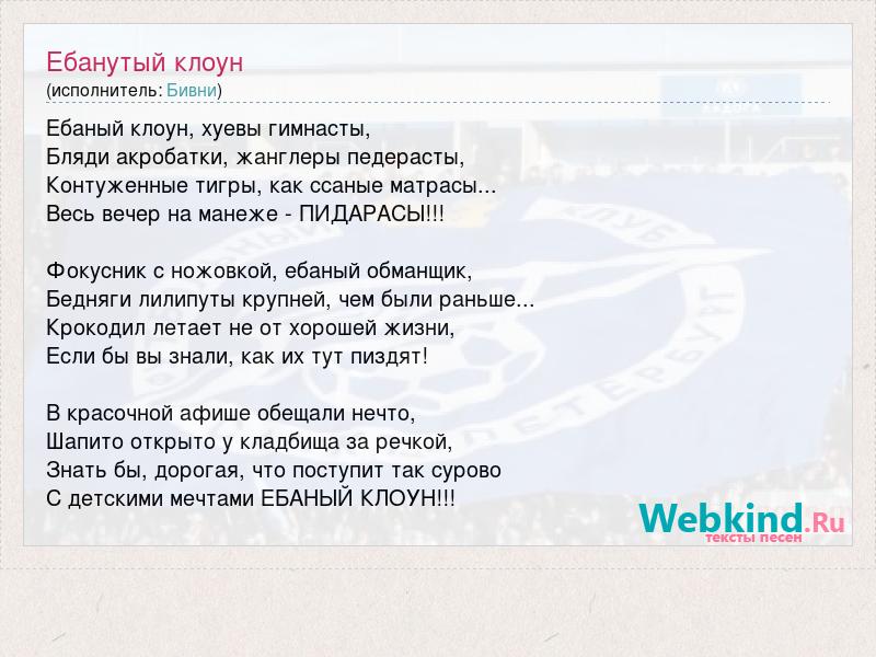 Ебаный клоун, хуевы гимнасты, Бляди акробатки, жанглеры педерасты, Контуженные тигры, как ссаные матрасы... Весь вечер на манеже - ПИДАРАСЫ!!! Фокусник с ножовкой, ебаный обманщик, Бедняги лилипуты крупней, чем были раньше... Крокодил летает не от хорошей жизни, Если бы вы знали, как их тут пиздят! В красочной афише обещали нечто, Шапито открыто у кладбища за речкой, Знать бы, дорогая, что поступит так сурово С детскими мечтами ЕБАНЫЙ КЛОУН!!!