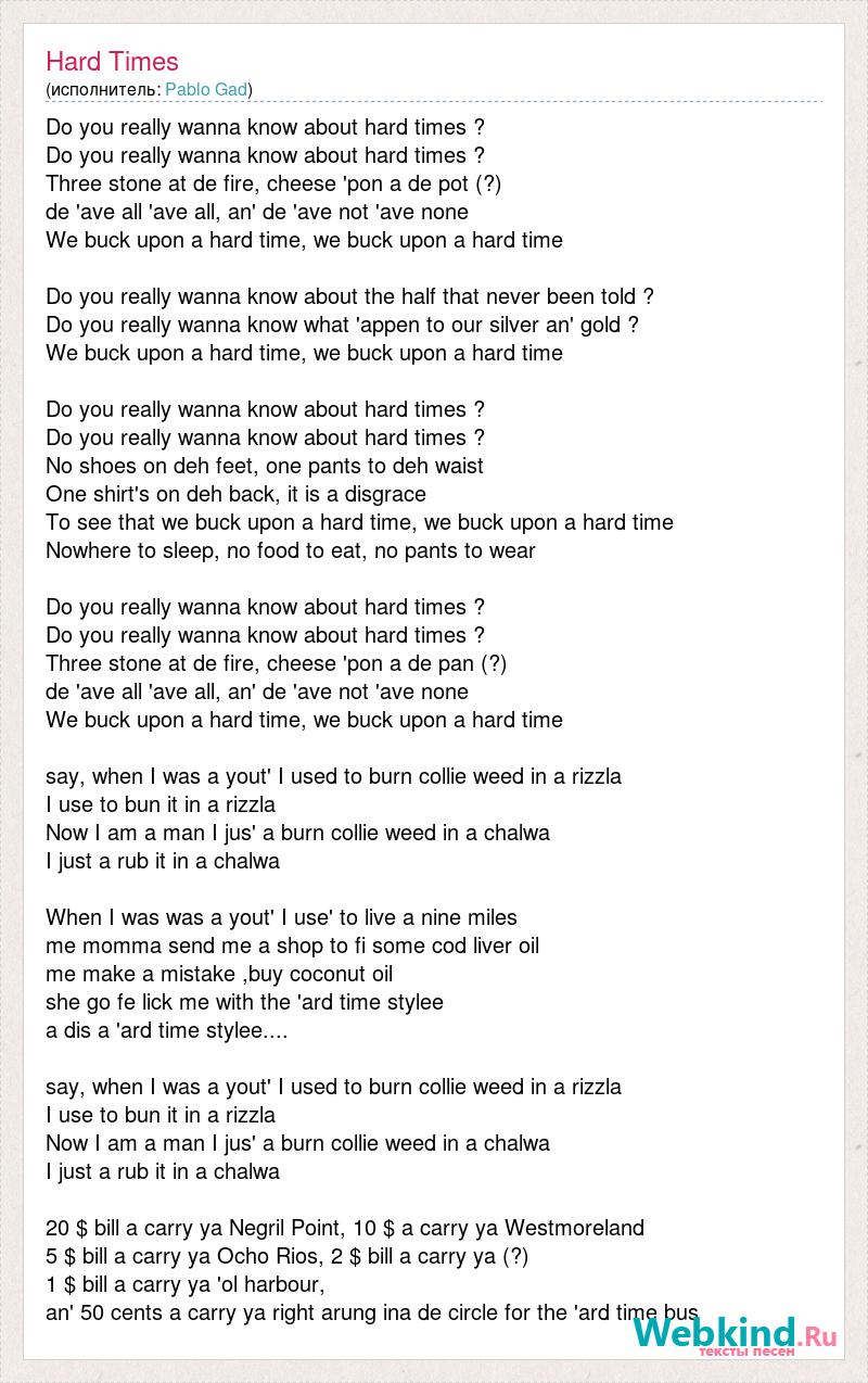 Do you really wanna know about hard times ? Do you really wanna know about hard times ? Three stone at de fire, cheese 'pon a de pot (?) de 'ave all 'ave all, an' de 'ave not 'ave none We buck upon a hard time, we buck upon a hard time Do you really wanna know about the half that never been told ? Do you really wanna know what 'appen to our silver an' gold ? We buck upon a hard time, we buck upon a hard time Do you really wanna know about hard times ? Do you really wanna know about hard times ? No shoes on deh feet, one pants to deh waist One shirt's on deh back, it is a disgrace To see that we buck upon a hard time, we buck upon a hard time Nowhere to sleep, no food to eat, no pants to wear Do you really wanna know about hard times ? Do you really wanna know about hard times ? Three stone at de fire, cheese 'pon a de pan (?) de 'ave all 'ave all, an' de 'ave not 'ave none We buck upon a hard time, we buck upon a hard time say, when I was a yout' I used to burn collie weed in a rizzla I use to bun it in a rizzla Now I am a man I jus' a burn collie weed in a chalwa I just a rub it in a chalwa When I was was a yout' I use' to live a nine miles me momma send me a shop to fi some cod liver oil me make a mistake ,buy coconut oil she go fe lick me with the 'ard time stylee a dis a 'ard time stylee.... say, when I was a yout' I used to burn collie weed in a rizzla I use to bun it in a rizzla Now I am a man I jus' a burn collie weed in a chalwa I just a rub it in a chalwa 20 $ bill a carry ya Negril Point, 10 $ a carry ya Westmoreland 5 $ bill a carry ya Ocho Rios, 2 $ bill a carry ya (?) 1 $ bill a carry ya 'ol harbour, an' 50 cents a carry ya right arung ina de circle for the 'ard time bus