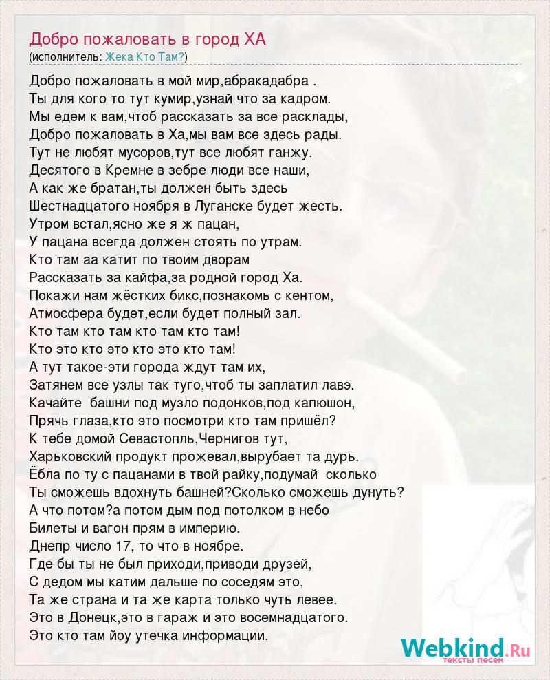Добро пожаловать в мой мир,абракадабра . Ты для кого то тут кумир,узнай что за кадром. Мы едем к вам,чтоб рассказать за все расклады, Добро пожаловать в Ха,мы вам все здесь рады. Тут не любят мусоров,тут все любят ганжу. Десятого в Кремне в зебре люди все наши, А как же братан,ты должен быть здесь Шестнадцатого ноября в Луганске будет жесть. Утром встал,ясно же я ж пацан, У пацана всегда должен стоять по утрам. Кто там аа катит по твоим дворам Рассказать за кайфа,за родной город Ха. Покажи нам жёстких бикс,познакомь с кентом, Атмосфера будет,если будет полный зал. Кто там кто там кто там кто там! Кто это кто это кто это кто там! А тут такое-эти города ждут там их, Затянем все узлы так туго,чтоб ты заплатил лавэ. Качайте башни под музло подонков,под капюшон, Прячь глаза,кто это посмотри кто там пришёл? К тебе домой Севастопль,Чернигов тут, Харьковский продукт прожевал,вырубает та дурь. Ёбла по ту с пацанами в твой райку,подумай сколько Ты сможешь вдохнуть башней?Сколько сможешь дунуть? А что потом?а потом дым под потолком в небо Билеты и вагон прям в империю. Днепр число 17, то что в ноябре. Где бы ты не был приходи,приводи друзей, С дедом мы катим дальше по соседям это, Та же страна и та же карта только чуть левее. Это в Донецк,это в гараж и это восемнадцатого. Это кто там йоу утечка информации.