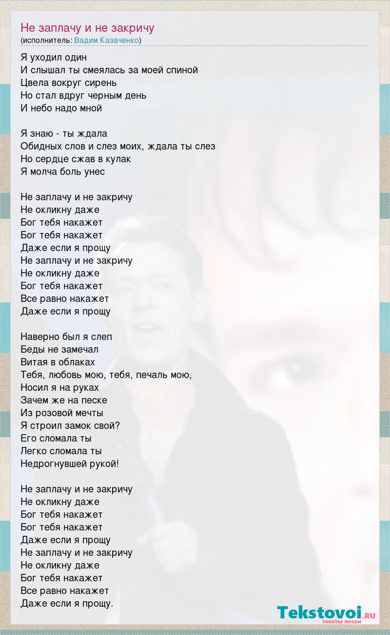 Я уходил один И слышал ты смеялась за моей спиной Цвела вокруг сирень Но стал вдруг черным день И небо надо мной Я знаю - ты ждала Обидных слов и слез моих, ждала ты слез Но сердце сжав в кулак Я молча боль унес Не заплачу и не закричу Не окликну даже Бог тебя накажет Бог тебя накажет Даже если я прощу Не заплачу и не закричу Не окликну даже Бог тебя накажет Все равно накажет Даже если я прощу Наверно был я слеп Беды не замечал Витая в облаках Тебя, любовь мою, тебя, печаль мою, Носил я на руках Зачем же на песке Из розовой мечты Я строил замок свой? Его сломала ты Легко сломала ты Недрогнувшей рукой! Не заплачу и не закричу Не окликну даже Бог тебя накажет Бог тебя накажет Даже если я прощу Не заплачу и не закричу Не окликну даже Бог тебя накажет Все равно накажет Даже если я прощу.
