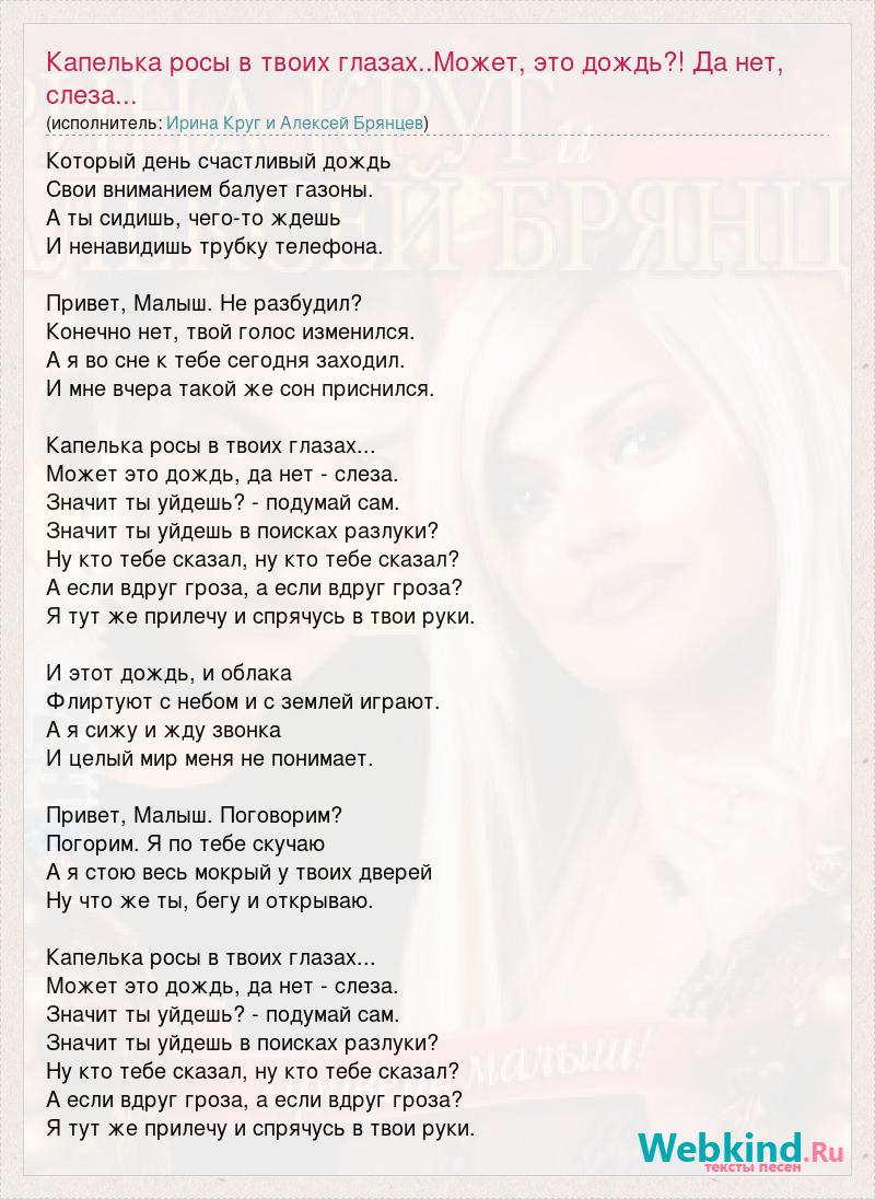 Главная→Исполнители→Ирина Круг И Алексей Брянцев→Капелька росы в твоих глазах..Может, это дождь?! Да нет, слеза...