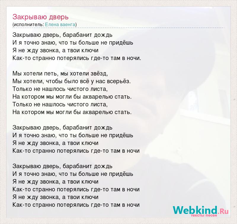 Закрываю дверь, барабанит дождь И я точно знаю, что ты больше не придёшь Я не жду звонка, а твои ключи Как-то странно потерялись где-то там в ночи. Мы хотели петь, мы хотели звёзд, Мы хотели, чтобы было всё у нас всерьёз. Только не нашлось чистого листа, На котором мы могли бы акварелью стать. Только не нашлось чистого листа, На котором мы могли бы акварелью стать. Закрываю дверь, барабанит дождь И я точно знаю, что ты больше не придёшь Я не жду звонка, а твои ключи Как-то странно потерялись где-то там в ночи Закрываю дверь, барабанит дождь И я точно знаю, что ты больше не придёшь Я не жду звонка, а твои ключи Как-то странно потерялись где-то там в ночи Я не жду звонка, а твои ключи Как-то странно потерялись где-то там в ночи