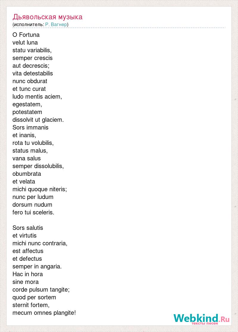 O Fortuna velut luna statu variabilis, semper crescis aut decrescis; vita detestabilis nunc obdurat et tunc curat ludo mentis aciem, egestatem, potestatem dissolvit ut glaciem. Sors immanis et inanis, rota tu volubilis, status malus, vana salus semper dissolubilis, obumbrata et velata michi quoque niteris; nunc per ludum dorsum nudum fero tui sceleris. Sors salutis et virtutis michi nunc contraria, est affectus et defectus semper in angaria. Hac in hora sine mora corde pulsum tangite; quod per sortem sternit fortem, mecum omnes plangite!