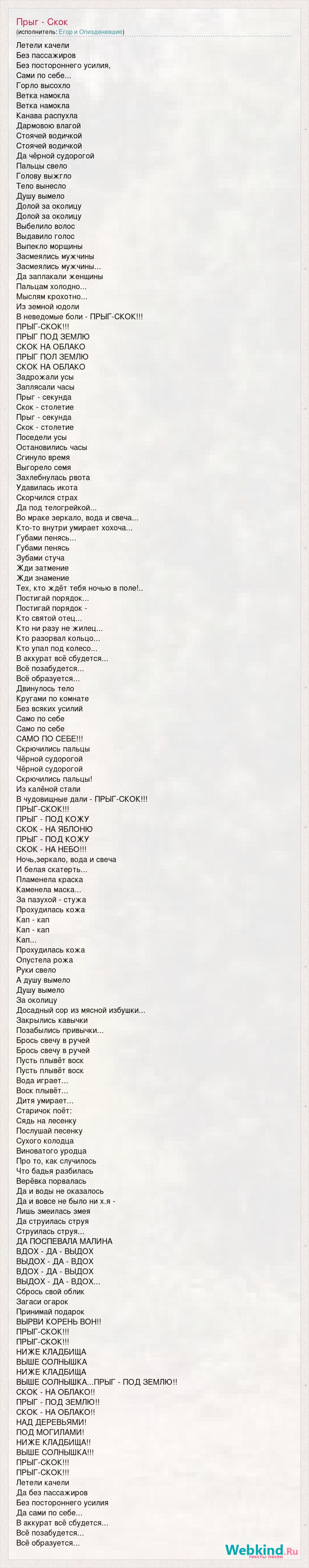 Летели качели Без пассажиров Без постороннего усилия, Сами по себе... Горло высохло Ветка намокла Ветка намокла Канава распухла Дармовою влагой Стоячей водичкой Стоячей водичкой Да чёрной судорогой Пальцы свело Голову выжгло Тело вынесло Душу вымело Долой за околицу Долой за околицу Выбелило волос Выдавило голос Выпекло морщины Засмеялись мужчины Засмеялись мужчины... Да заплакали женщины Пальцам холодно... Мыслям крохотно... Из земной юдоли В неведомые боли - ПРЫГ-СКОК!!! ПРЫГ-СКОК!!! ПРЫГ ПОД ЗЕМЛЮ СКОК НА ОБЛАКО ПРЫГ ПОЛ ЗЕМЛЮ СКОК НА ОБЛАКО Задрожали усы Заплясали часы Прыг - секунда Скок - столетие Прыг - секунда Скок - столетие Поседели усы Остановились часы Сгинуло время Выгорело семя Захлебнулась рвота Удавилась икота Скорчился страх Да под телогрейкой... Во мраке зеркало, вода и свеча... Кто-то внутри умирает хохоча... Губами пенясь... Губами пенясь Зубами стуча Жди затмение Жди знамение Тех, кто ждёт тебя ночью в поле!.. Постигай порядок... Постигай порядок - Кто святой отец... Кто ни разу не жилец... Кто разорвал кольцо... Кто упал под колесо... В аккурат всё сбудется... Всё позабудется... Всё образуется... Двинулось тело Кругами по комнате Без всяких усилий Само по себе Само по себе САМО ПО СЕБЕ!!! Скрючились пальцы Чёрной судорогой Чёрной судорогой Скрючились пальцы! Из калёной стали В чудовищные дали - ПРЫГ-СКОК!!! ПРЫГ-СКОК!!! ПРЫГ - ПОД КОЖУ СКОК - НА ЯБЛОНЮ ПРЫГ - ПОД КОЖУ СКОК - НА НЕБО!!! Ночь,зеркало, вода и свеча И белая скатерть... Пламенела краска Каменела маска... За пазухой - стужа Прохудилась кожа Кап - кап Кап - кап Кап... Прохудилась кожа Опустела рожа Руки свело А душу вымело Душу вымело За околицу Досадный сор из мясной избушки... Закрылись кавычки Позабылись привычки... Брось свечу в ручей Брось свечу в ручей Пусть плывёт воск Пусть плывёт воск Вода играет... Воск плывёт... Дитя умирает... Старичок поёт: Сядь на лесенку Послушай песенку Сухого колодца Виноватого уродца Про то, как случилось Что бадья разбилась Верёвка порвалась Да и воды не оказалось Да и вовсе не было ни х.я - Лишь змеилась змея Да струилась струя Струилась струя... ДА ПОСПЕВАЛА МАЛИНА ВДОХ - ДА - ВЫДОХ ВЫДОХ - ДА - ВДОХ ВДОХ - ДА - ВЫДОХ ВЫДОХ - ДА - ВДОХ... Сбрось свой облик Загаси огарок Принимай подарок ВЫРВИ КОРЕНЬ ВОН!! ПРЫГ-СКОК!!! ПРЫГ-СКОК!!! НИЖЕ КЛАДБИЩА ВЫШЕ СОЛНЫШКА НИЖЕ КЛАДБИЩА ВЫШЕ СОЛНЫШКА...ПРЫГ - ПОД ЗЕМЛЮ!! СКОК - НА ОБЛАКО!! ПРЫГ - ПОД ЗЕМЛЮ!! СКОК - НА ОБЛАКО!! НАД ДЕРЕВЬЯМИ! ПОД МОГИЛАМИ! НИЖЕ КЛАДБИЩА!! ВЫШЕ СОЛНЫШКА!!! ПРЫГ-СКОК!!! ПРЫГ-СКОК!!! Летели качели Да без пассажиров Без постороннего усилия Да сами по себе... В аккурат всё сбудется... Всё позабудется... Всё образуется...