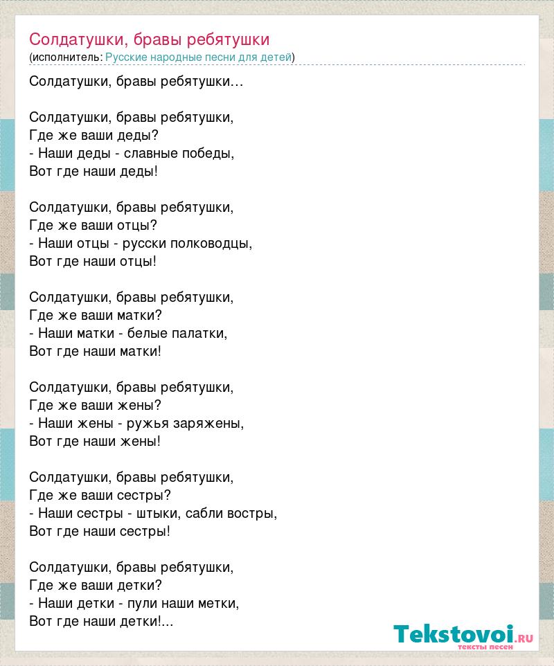 Солдатушки, бравы ребятушки… Солдатушки, бравы ребятушки, Где же ваши деды? - Наши деды - славные победы, Вот где наши деды! Солдатушки, бравы ребятушки, Где же ваши отцы? - Наши отцы - русски полководцы, Вот где наши отцы! Солдатушки, бравы ребятушки, Где же ваши матки? - Наши матки - белые палатки, Вот где наши матки! Солдатушки, бравы ребятушки, Где же ваши жены? - Наши жены - ружья заряжены, Вот где наши жены! Солдатушки, бравы ребятушки, Где же ваши сестры? - Наши сестры - штыки, сабли востры, Вот где наши сестры! Солдатушки, бравы ребятушки, Где же ваши детки? - Наши детки - пули наши метки, Вот где наши детки!...