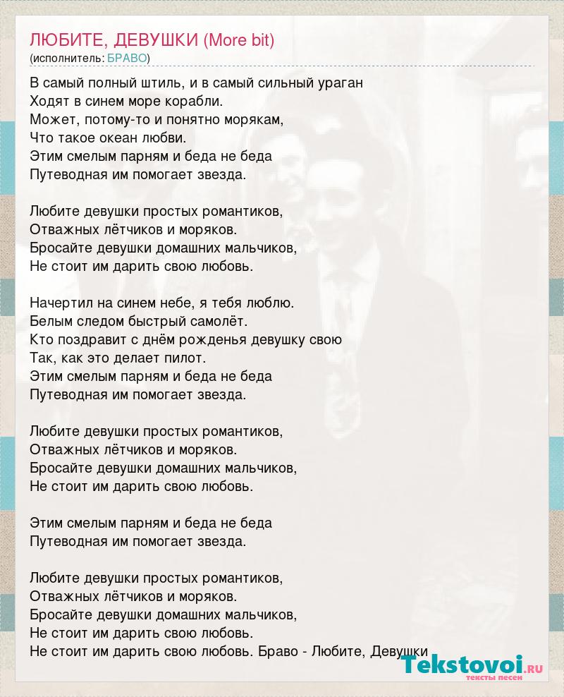 В самый полный штиль, и в самый сильный ураган Ходят в синем море корабли. Может, потому-то и понятно морякам, Что такое океан любви. Этим смелым парням и беда не беда Путеводная им помогает звезда. Любите девушки простых романтиков, Отважных лётчиков и моряков. Бросайте девушки домашних мальчиков, Не стоит им дарить свою любовь. Начертил на синем небе, я тебя люблю. Белым следом быстрый самолёт. Кто поздравит с днём рожденья девушку свою Так, как это делает пилот. Этим смелым парням и беда не беда Путеводная им помогает звезда. Любите девушки простых романтиков, Отважных лётчиков и моряков. Бросайте девушки домашних мальчиков, Не стоит им дарить свою любовь. Этим смелым парням и беда не беда Путеводная им помогает звезда. Любите девушки простых романтиков, Отважных лётчиков и моряков. Бросайте девушки домашних мальчиков, Не стоит им дарить свою любовь. Не стоит им дарить свою любовь. Браво - Любите, Девушки