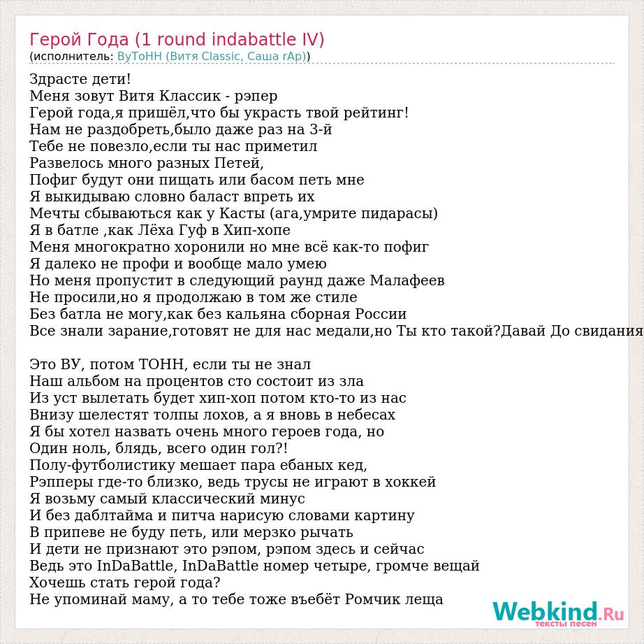 Здрасте дети! Меня зовут Витя Классик - рэпер Герой года,я пришёл,что бы украсть твой рейтинг! Нам не раздобреть,было даже раз на 3-й Тебе не повезло,если ты нас приметил Развелось много разных Петей, Пофиг будут они пищать или басом петь мне Я выкидываю словно баласт впреть их Мечты сбываються как у Касты (ага,умрите пидарасы) Я в батле ,как Лёха Гуф в Хип-хопе Меня многократно хоронили но мне всё как-то пофиг Я далеко не профи и вообще мало умею Но меня пропустит в следующий раунд даже Малафеев Не просили,но я продолжаю в том же стиле Без батла не могу,как без кальяна сборная России Все знали зарание,готовят не для нас медали,но Ты кто такой?Давай До свидания Это ВУ, потом ТОНН, если ты не знал Наш альбом на процентов сто состоит из зла Из уст вылетать будет хип-хоп потом кто-то из нас Внизу шелестят толпы лохов, а я вновь в небесах Я бы хотел назвать очень много героев года, но Один ноль, блядь, всего один гол?! Полу-футболистику мешает пара ебаных кед, Рэпперы где-то близко, ведь трусы не играют в хоккей Я возьму самый классический минус И без даблтайма и питча нарисую словами картину В припеве не буду петь, или мерзко рычать И дети не признают это рэпом, рэпом здесь и сейчас Ведь это InDaBattle, InDaBattle номер четыре, громче вещай Хочешь стать герой года? Не упоминай маму, а то тебе тоже въебёт Ромчик леща
