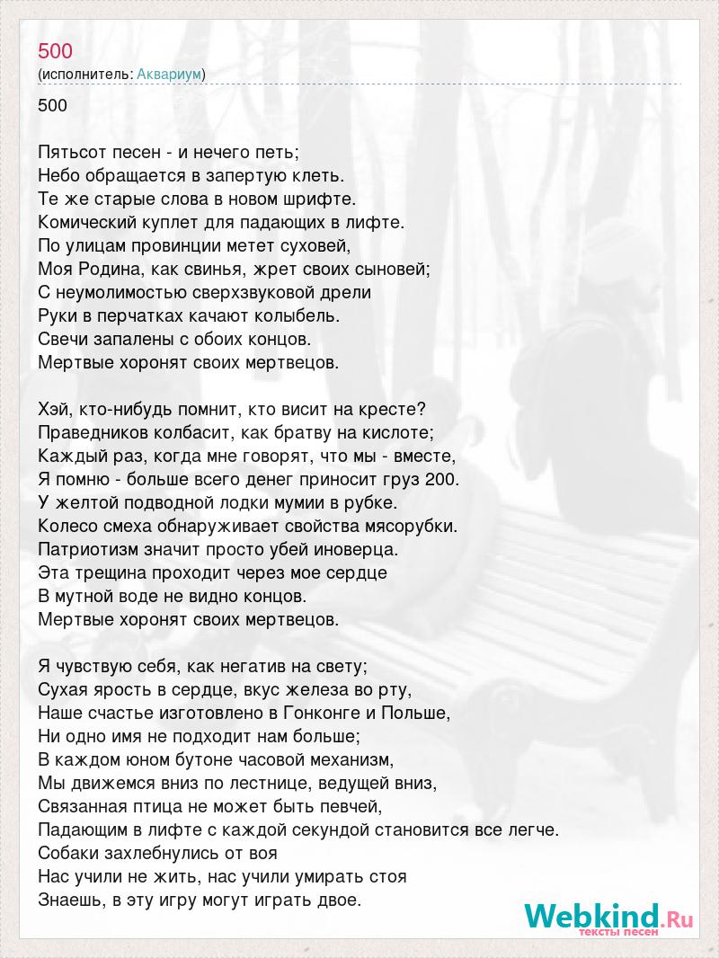 500 Пятьсот песен - и нечего петь; Небо обращается в запертую клеть. Те же старые слова в новом шрифте. Комический куплет для падающих в лифте. По улицам провинции метет суховей, Моя Родина, как свинья, жрет своих сыновей; С неумолимостью сверхзвуковой дрели Руки в перчатках качают колыбель. Свечи запалены с обоих концов. Мертвые хоронят своих мертвецов. Хэй, кто-нибудь помнит, кто висит на кресте? Праведников колбасит, как братву на кислоте; Каждый раз, когда мне говорят, что мы - вместе, Я помню - больше всего денег приносит груз 200. У желтой подводной лодки мумии в рубке. Колесо смеха обнаруживает свойства мясорубки. Патриотизм значит просто убей иноверца. Эта трещина проходит через мое сердце В мутной воде не видно концов. Мертвые хоронят своих мертвецов. Я чувствую себя, как негатив на свету; Сухая ярость в сердце, вкус железа во рту, Наше счастье изготовлено в Гонконге и Польше, Ни одно имя не подходит нам больше; В каждом юном бутоне часовой механизм, Мы движемся вниз по лестнице, ведущей вниз, Связанная птица не может быть певчей, Падающим в лифте с каждой секундой становится все легче. Собаки захлебнулись от воя Нас учили не жить, нас учили умирать стоя Знаешь, в эту игру могут играть двое.