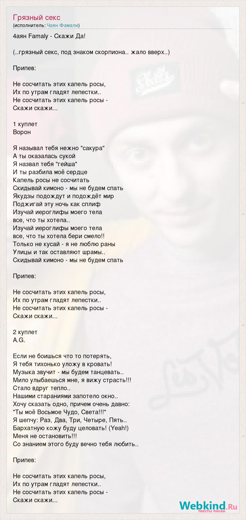 4аян Famaly - Скажи Да! (..грязный секс, под знаком скорпиона.. жало вверх..) Припев: Не сосчитать этих капель росы, Их по утрам гладят лепестки.. Не сосчитать этих капель росы - Скажи скажи... 1 куплет Ворон Я называл тебя нежно "сакура" А ты оказалась сукой Я назвал тебя "гейша" И ты разбила моё сердце Капель росы не сосчитать Скидывай кимоно - мы не будем спать Якудзы подождут и подождёт мир Поджигай эту ночь как сплиф Изучай иероглифы моего тела все, что ты хотела.. Изучай иероглифы моего тела все, что ты хотела бери смело!! Только не кусай - я не люблю раны Улицы и так оставляют шрамы.. Скидывай кимоно - мы не будем спать Припев: Не сосчитать этих капель росы, Их по утрам гладят лепестки.. Не сосчитать этих капель росы - Скажи скажи... 2 куплет A.G. Если не боишься что то потерять, Я тебя тихонько уложу в кровать! Музыка звучит - мы будем танцевать.. Мило улыбаешься мне, я вижу страсть!!! Стало вдруг тепло.. Нашими стараниями запотело окно.. Хочу сказать одно, причем очень давно: "Ты моё Восьмое Чудо, Света!!!" Я шепчу: Раз, Два, Три, Четыре, Пять.. Бархатную кожу буду целовать! (Yeah!) Меня не остановить!!! Со знанием этого буду вечно тебя любить.. Припев: Не сосчитать этих капель росы, Их по утрам гладят лепестки.. Не сосчитать этих капель росы - Скажи скажи...