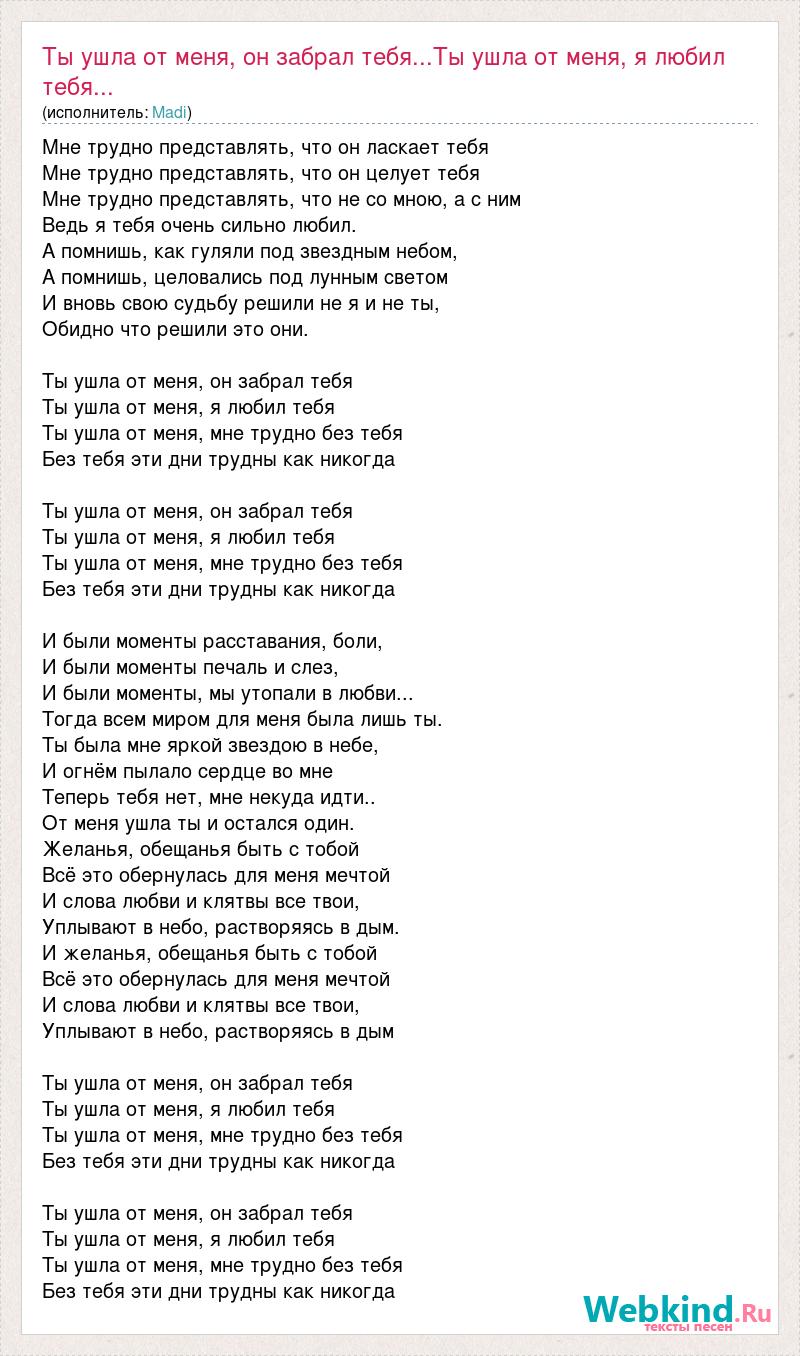 Мне трудно представлять, что он ласкает тебя Мне трудно представлять, что он целует тебя Мне трудно представлять, что не со мною, а с ним Ведь я тебя очень сильно любил. А помнишь, как гуляли под звездным небом, А помнишь, целовались под лунным светом И вновь свою судьбу решили не я и не ты, Обидно что решили это они. Ты ушла от меня, он забрал тебя Ты ушла от меня, я любил тебя Ты ушла от меня, мне трудно без тебя Без тебя эти дни трудны как никогда Ты ушла от меня, он забрал тебя Ты ушла от меня, я любил тебя Ты ушла от меня, мне трудно без тебя Без тебя эти дни трудны как никогда И были моменты расставания, боли, И были моменты печаль и слез, И были моменты, мы утопали в любви... Тогда всем миром для меня была лишь ты. Ты была мне яркой звездою в небе, И огнём пылало сердце во мне Теперь тебя нет, мне некуда идти.. От меня ушла ты и остался один. Желанья, обещанья быть с тобой Всё это обернулась для меня мечтой И слова любви и клятвы все твои, Уплывают в небо, растворяясь в дым. И желанья, обещанья быть с тобой Всё это обернулась для меня мечтой И слова любви и клятвы все твои, Уплывают в небо, растворяясь в дым Ты ушла от меня, он забрал тебя Ты ушла от меня, я любил тебя Ты ушла от меня, мне трудно без тебя Без тебя эти дни трудны как никогда Ты ушла от меня, он забрал тебя Ты ушла от меня, я любил тебя Ты ушла от меня, мне трудно без тебя Без тебя эти дни трудны как никогда