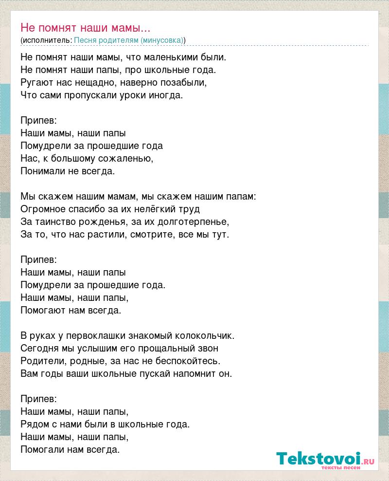 Не помнят наши мамы, что маленькими были. Не помнят наши папы, про школьные года. Ругают нас нещадно, наверно позабыли, Что сами пропускали уроки иногда. Припев: Наши мамы, наши папы Помудрели за прошедшие года Нас, к большому сожаленью, Понимали не всегда. Мы скажем нашим мамам, мы скажем нашим папам: Огромное спасибо за их нелёгкий труд За таинство рожденья, за их долготерпенье, За то, что нас растили, смотрите, все мы тут. Припев: Наши мамы, наши папы Помудрели за прошедшие года. Наши мамы, наши папы, Помогают нам всегда. В руках у первоклашки знакомый колокольчик. Сегодня мы услышим его прощальный звон Родители, родные, за нас не беспокойтесь. Вам годы ваши школьные пускай напомнит он. Припев: Наши мамы, наши папы, Рядом с нами были в школьные года. Наши мамы, наши папы, Помогали нам всегда.