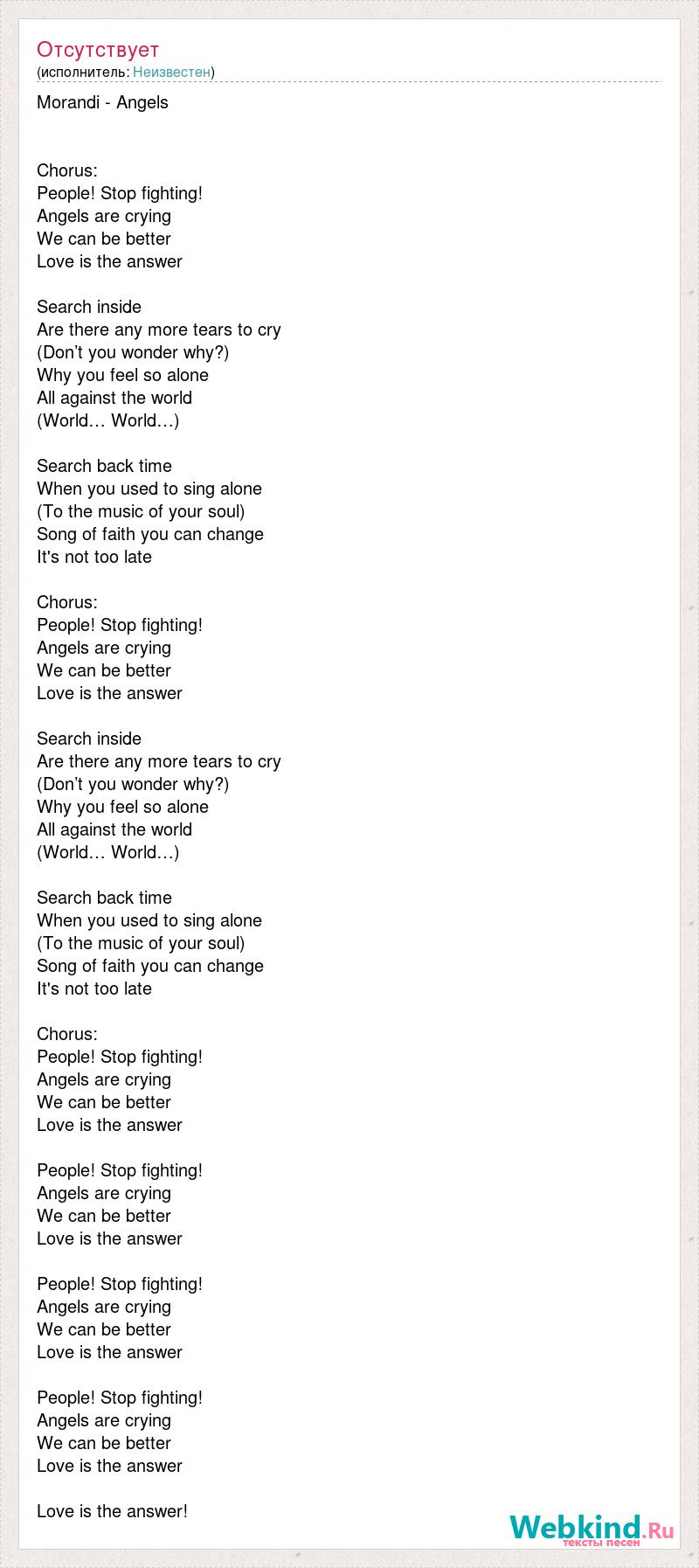 Morandi - Angels Chorus: People! Stop fighting! Angels are crying We can be better Love is the answer Search inside Are there any more tears to cry (Don’t you wonder why?) Why you feel so alone All against the world (World… World…) Search back time When you used to sing alone (To the music of your soul) Song of faith you can change It's not too late Chorus: People! Stop fighting! Angels are crying We can be better Love is the answer Search inside Are there any more tears to cry (Don’t you wonder why?) Why you feel so alone All against the world (World… World…) Search back time When you used to sing alone (To the music of your soul) Song of faith you can change It's not too late Chorus: People! Stop fighting! Angels are crying We can be better Love is the answer People! Stop fighting! Angels are crying We can be better Love is the answer People! Stop fighting! Angels are crying We can be better Love is the answer People! Stop fighting! Angels are crying We can be better Love is the answer Love is the answer!
