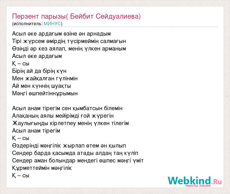Асыл әке ардағым өзіне ән арнадым Тірі жүрсем өмірдің түсірмеймін салмағын Өзіңді әр кез аялап, менің үлкен арманым Асыл әке ардағым Қ – сы Бірің ай да бірің күн Мен жайқалған гүлінмін Ай мен күннің шуақты Мәңгі өшпейтіннұрымын Асыл анам тірегім сен қымбатсын білемін Алақаның аялы мейірімді ғой жүрегін Жаулығыңды кірлетпеу менің үлкен тілегім Асыл анам тірегім Қ – сы Өздерінді мәңгілік жырлап өтем ән қылып Сендер барда қасымда атады алдаң таң күліп Сендер аман болындар мендегі өшпес мәңгі үміт Құрметтеймін мәңгілік Қ – сы