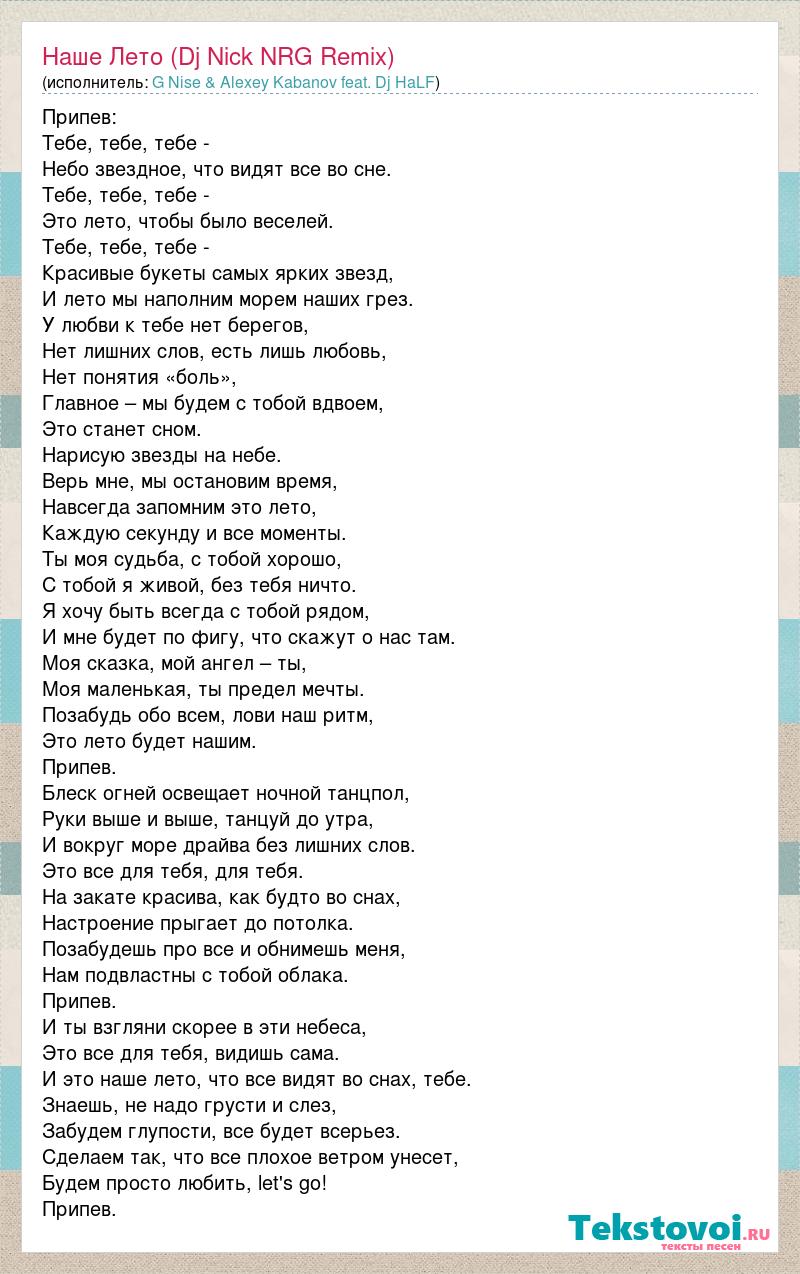 Припев: Тебе, тебе, тебе - Небо звездное, что видят все во сне. Тебе, тебе, тебе - Это лето, чтобы было веселей. Тебе, тебе, тебе - Красивые букеты самых ярких звезд, И лето мы наполним морем наших грез. У любви к тебе нет берегов, Нет лишних слов, есть лишь любовь, Нет понятия «боль», Главное – мы будем с тобой вдвоем, Это станет сном. Нарисую звезды на небе. Верь мне, мы остановим время, Навсегда запомним это лето, Каждую секунду и все моменты. Ты моя судьба, с тобой хорошо, С тобой я живой, без тебя ничто. Я хочу быть всегда с тобой рядом, И мне будет по фигу, что скажут о нас там. Моя сказка, мой ангел – ты, Моя маленькая, ты предел мечты. Позабудь обо всем, лови наш ритм, Это лето будет нашим. Припев. Блеск огней освещает ночной танцпол, Руки выше и выше, танцуй до утра, И вокруг море драйва без лишних слов. Это все для тебя, для тебя. На закате красива, как будто во снах, Настроение прыгает до потолка. Позабудешь про все и обнимешь меня, Нам подвластны с тобой облака. Припев. И ты взгляни скорее в эти небеса, Это все для тебя, видишь сама. И это наше лето, что все видят во снах, тебе. Знаешь, не надо грусти и слез, Забудем глупости, все будет всерьез. Сделаем так, что все плохое ветром унесет, Будем просто любить, let's go! Припев.