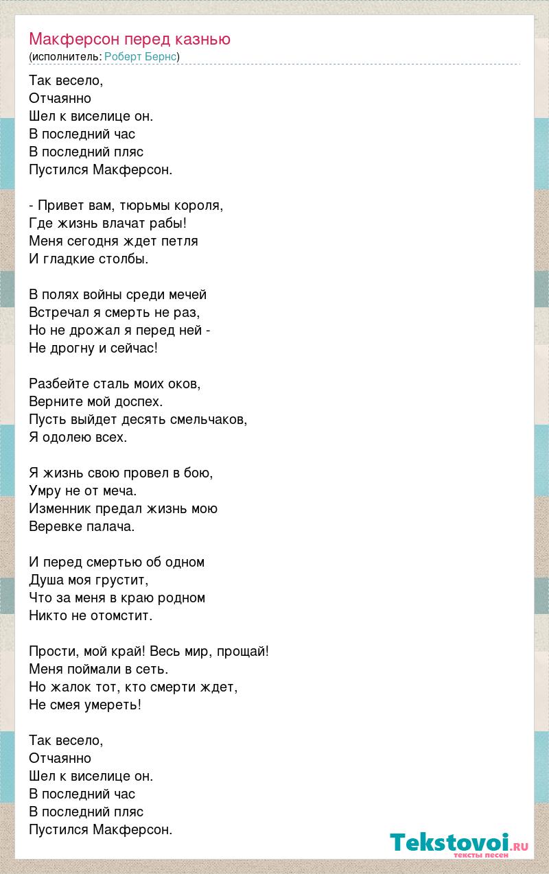 Так весело, Отчаянно Шел к виселице он. В последний час В последний пляс Пустился Макферсон. - Привет вам, тюрьмы короля, Где жизнь влачат рабы! Меня сегодня ждет петля И гладкие столбы. В полях войны среди мечей Встречал я смерть не раз, Но не дрожал я перед ней - Не дрогну и сейчас! Разбейте сталь моих оков, Верните мой доспех. Пусть выйдет десять смельчаков, Я одолею всех. Я жизнь свою провел в бою, Умру не от меча. Изменник предал жизнь мою Веревке палача. И перед смертью об одном Душа моя грустит, Что за меня в краю родном Никто не отомстит. Прости, мой край! Весь мир, прощай! Меня поймали в сеть. Но жалок тот, кто смерти ждет, Не смея умереть! Так весело, Отчаянно Шел к виселице он. В последний час В последний пляс Пустился Макферсон.
