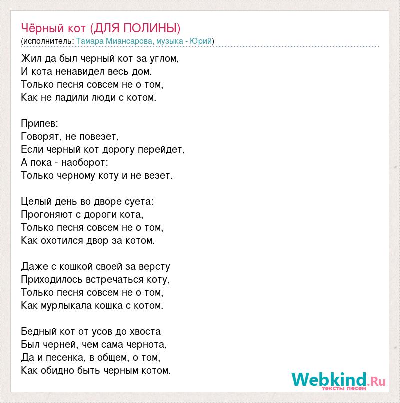 Жил да был черный кот за углом, И кота ненавидел весь дом. Только песня совсем не о том, Как не ладили люди с котом. Припев: Говорят, не повезет, Если черный кот дорогу перейдет, А пока - наоборот: Только черному коту и не везет. Целый день во дворе суета: Прогоняют с дороги кота, Только песня совсем не о том, Как охотился двор за котом. Даже с кошкой своей за версту Приходилось встречаться коту, Только песня совсем не о том, Как мурлыкала кошка с котом. Бедный кот от усов до хвоста Был черней, чем сама чернота, Да и песенка, в общем, о том, Как обидно быть черным котом.