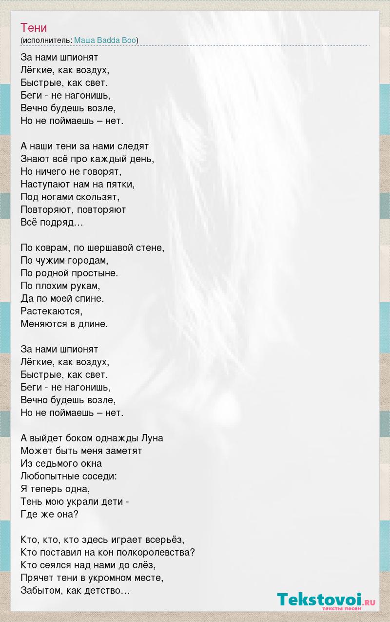 За нами шпионят Лёгкие, как воздух, Быстрые, как свет. Беги - не нагонишь, Вечно будешь возле, Но не поймаешь – нет. А наши тени за нами следят Знают всё про каждый день, Но ничего не говорят, Наступают нам на пятки, Под ногами скользят, Повторяют, повторяют Всё подряд… По коврам, по шершавой стене, По чужим городам, По родной простыне. По плохим рукам, Да по моей спине. Растекаются, Меняются в длине. За нами шпионят Лёгкие, как воздух, Быстрые, как свет. Беги - не нагонишь, Вечно будешь возле, Но не поймаешь – нет. А выйдет боком однажды Луна Может быть меня заметят Из седьмого окна Любопытные соседи: Я теперь одна, Тень мою украли дети - Где же она? Кто, кто, кто здесь играет всерьёз, Кто поставил на кон полкоролевства? Кто сеялся над нами до слёз, Прячет тени в укромном месте, Забытом, как детство…