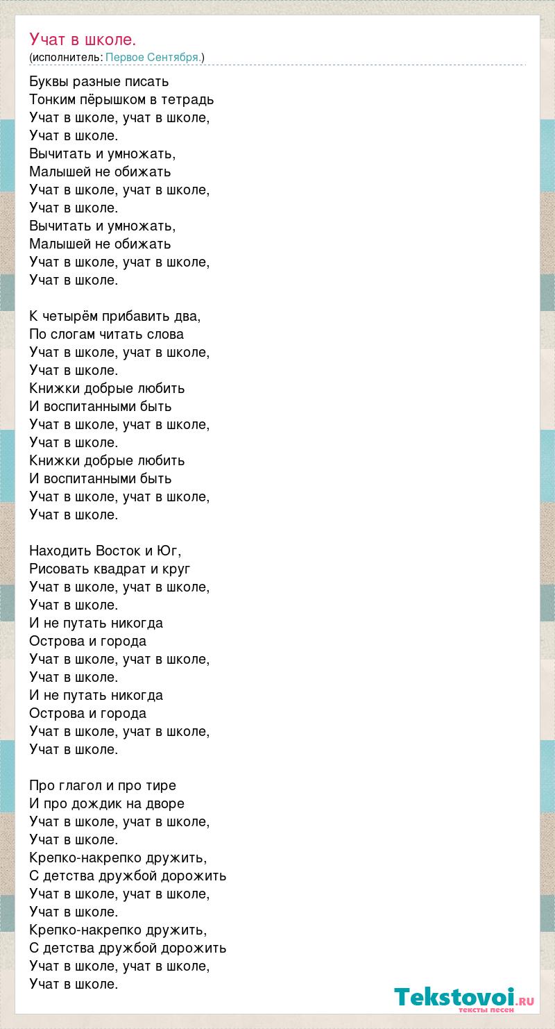 Буквы разные писать Тонким пёрышком в тетрадь Учат в школе, учат в школе, Учат в школе. Вычитать и умножать, Малышей не обижать Учат в школе, учат в школе, Учат в школе. Вычитать и умножать, Малышей не обижать Учат в школе, учат в школе, Учат в школе. К четырём прибавить два, По слогам читать слова Учат в школе, учат в школе, Учат в школе. Книжки добрые любить И воспитанными быть Учат в школе, учат в школе, Учат в школе. Книжки добрые любить И воспитанными быть Учат в школе, учат в школе, Учат в школе. Находить Восток и Юг, Рисовать квадрат и круг Учат в школе, учат в школе, Учат в школе. И не путать никогда Острова и города Учат в школе, учат в школе, Учат в школе. И не путать никогда Острова и города Учат в школе, учат в школе, Учат в школе. Про глагол и про тире И про дождик на дворе Учат в школе, учат в школе, Учат в школе. Крепко-накрепко дружить, С детства дружбой дорожить Учат в школе, учат в школе, Учат в школе. Крепко-накрепко дружить, С детства дружбой дорожить Учат в школе, учат в школе, Учат в школе.