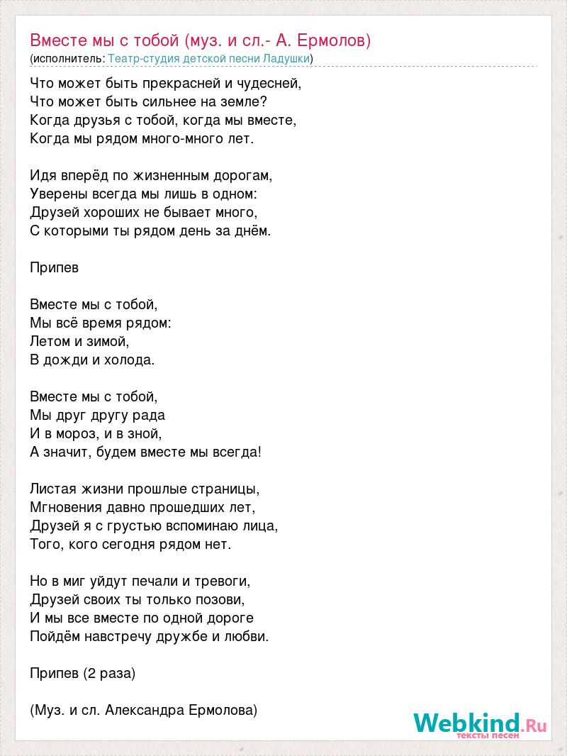 Что может быть прекрасней и чудесней, Что может быть сильнее на земле? Когда друзья с тобой, когда мы вместе, Когда мы рядом много-много лет. Идя вперёд по жизненным дорогам, Уверены всегда мы лишь в одном: Друзей хороших не бывает много, С которыми ты рядом день за днём. Припев Вместе мы с тобой, Мы всё время рядом: Летом и зимой, В дожди и холода. Вместе мы с тобой, Мы друг другу рада И в мороз, и в зной, А значит, будем вместе мы всегда! Листая жизни прошлые страницы, Мгновения давно прошедших лет, Друзей я с грустью вспоминаю лица, Того, кого сегодня рядом нет. Но в миг уйдут печали и тревоги, Друзей своих ты только позови, И мы все вместе по одной дороге Пойдём навстречу дружбе и любви. Припев (2 раза) (Муз. и сл. Александра Ермолова)