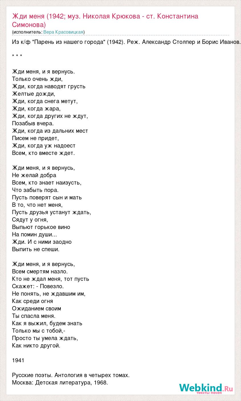 Из к/ф "Парень из нашего города" (1942). Реж. Александр Столпер и Борис Иванов. * * * Жди меня, и я вернусь. Только очень жди, Жди, когда наводят грусть Желтые дожди, Жди, когда снега метут, Жди, когда жара, Жди, когда других не ждут, Позабыв вчера. Жди, когда из дальних мест Писем не придет, Жди, когда уж надоест Всем, кто вместе ждет. Жди меня, и я вернусь, Не желай добра Всем, кто знает наизусть, Что забыть пора. Пусть поверят сын и мать В то, что нет меня, Пусть друзья устанут ждать, Сядут у огня, Выпьют горькое вино На помин души... Жди. И с ними заодно Выпить не спеши. Жди меня, и я вернусь, Всем смертям назло. Кто не ждал меня, тот пусть Скажет: - Повезло. Не понять, не ждавшим им, Как среди огня Ожиданием своим Ты спасла меня. Как я выжил, будем знать Только мы с тобой,- Просто ты умела ждать, Как никто другой. 1941 Русские поэты. Антология в четырех томах. Москва: Детская литература, 1968.