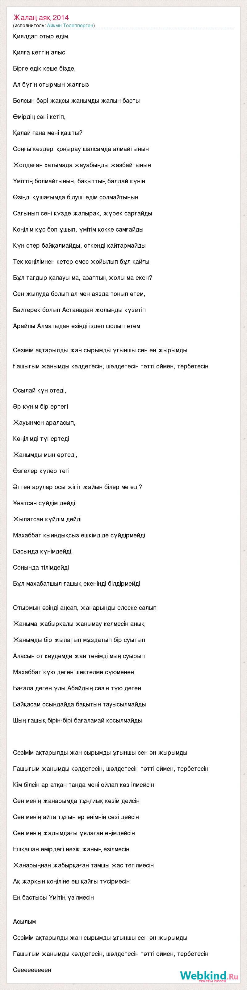 Қиялдап отыр едім, Қияға кеттің алыс Бірге едік кеше бізде, Ал бүгін отырмын жалғыз Болсын бәрі жақсы жанымды жалын басты Өмірдің сәні кетіп, Қалай ғана мәні қашты? Соңғы кездері қоңырау шалсамда алмайтынын Жолдаған хатымада жауабыңды жазбайтынын Үміттің болмайтынын, бақыттың балдай күнін Өзіңді құшағымда білуші едім солмайтынын Сағынып сені күзде жапырақ, жүрек сарғайды Көңілім құс боп ұшып, үмітім көкке самғайды Күн өтер байқалмайды, өткенді қайтармайды Тек көңілімнен кетер емес жойылып бұл қайғы Бұл тағдыр қалауы ма, азаптың жолы ма екен? Сен жылуда болып ал мен аязда тонып өтем, Байтерек болып Астанадан жолыңды күзетіп Арайлы Алматыдан өзіңді іздеп шолып өтем Сезімім ақтарылды жан сырымды ұғыншы сен ән жырымды Ғашығым жанымды көлдетесін, шөлдетесін тәтті оймен, тербетесін Осылай күн өтеді, Әр күнім бір ертегі Жауынмен араласып, Көңілімді түнертеді Жанымды мың өртеді, Өзгелер күлер тегі Әттен арулар осы жігіт жайын білер ме еді? Ұнатсан сүйдім дейді, Жылатсан күйдім дейді Махаббат қыиндықсыз ешкімдіде сүйдірмейді Басында күнімдейді, Соңында тілімдейді Бұл махабатшыл ғашық екенінді білдірмейді Отырмын өзіңді аңсап, жанарынды елеске салып Жаныма жабырқалы жанымау келмесін анық Жанымды бір жылатып мұздатып бір суытып Аласын от кеудемде жан тәнімді мың суырып Махаббат күю деген шектелме сүюменен Бағала деген ұлы Абайдың сөзін түю деген Байқасам осындайда бақытын тауысылмайды Шың ғашық бірін-бірі бағаламай қосылмайды Сезімім ақтарылды жан сырымды ұғыншы сен ән жырымды Ғашығым жанымды көлдетесін, шөлдетесін тәтті оймен, тербетесін Кім білсін ар атқан танда мені ойлап көз ілмейсін Сен менің жанарымда тұңғиық көзім дейсін Сен менің айта тұғын әр әнімнің сөзі дейсін Сен менің жадымдағы ұялаған өңімдейсін Ешқашан өмірдегі нәзік жаның езілмесін Жанарыңнан жабырқаған тамшы жас төгілмесін Ақ жарқын көңіліне еш қайғы түсірмесін Ең бастысы Үмітің үзілмесін Асылым Сезімім ақтарылды жан сырымды ұғыншы сен ән жырымды Ғашығым жанымды көлдетесін, шөлдетесін тәтті оймен, тербетесін Сееееееееен