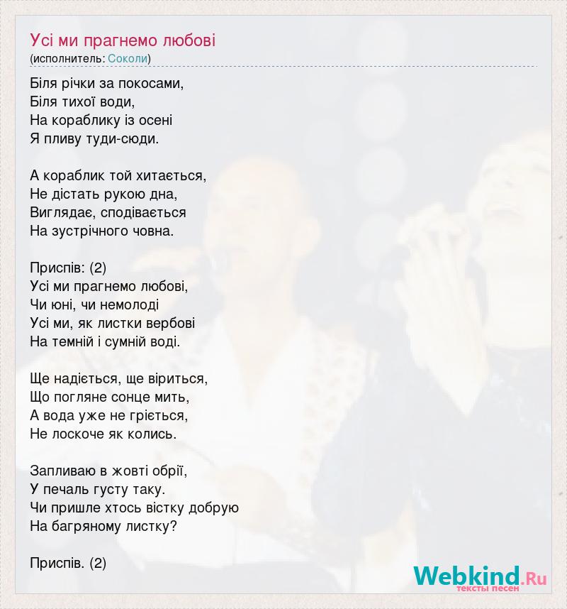 Біля річки за покосами, Біля тихої води, На кораблику із осені Я пливу туди-сюди. А кораблик той хитається, Не дістать рукою дна, Виглядає, сподівається На зустрічного човна. Приспів: (2) Усі ми прагнемо любові, Чи юні, чи немолоді Усі ми, як листки вербові На темній і сумній воді. Ще надіється, ще віриться, Що погляне сонце мить, А вода уже не гріється, Не лоскоче як колись. Запливаю в жовті обрії, У печаль густу таку. Чи пришле хтось вістку добрую На багряному листку? Приспів. (2)
