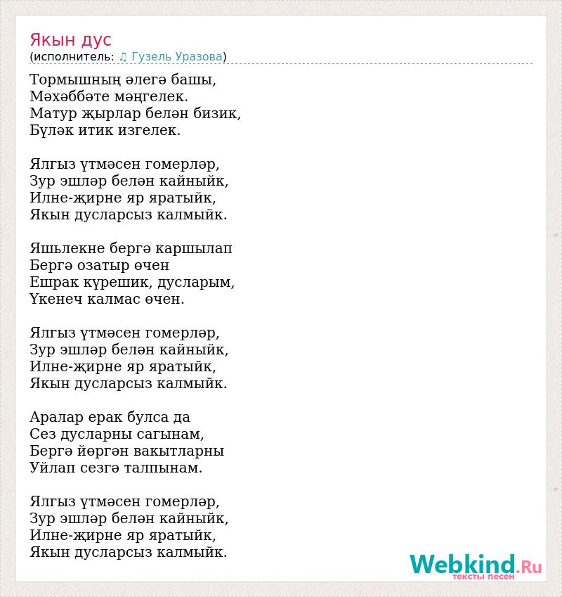 Тормышның әлегә башы, Мәхәббәте мәңгелек. Матур җырлар белән бизик, Бүләк итик изгелек. Ялгыз үтмәсен гомерләр, Зур эшләр белән кайныйк, Илне-җирне яр яратыйк, Якын дусларсыз калмыйк. Яшьлекне бергә каршылап Бергә озатыр өчен Ешрак күрешик, дусларым, Үкенеч калмас өчен. Ялгыз үтмәсен гомерләр, Зур эшләр белән кайныйк, Илне-җирне яр яратыйк, Якын дусларсыз калмыйк. Аралар ерак булса да Сез дусларны сагынам, Бергә йөргән вакытларны Уйлап сезгә талпынам. Ялгыз үтмәсен гомерләр, Зур эшләр белән кайныйк, Илне-җирне яр яратыйк, Якын дусларсыз калмыйк.