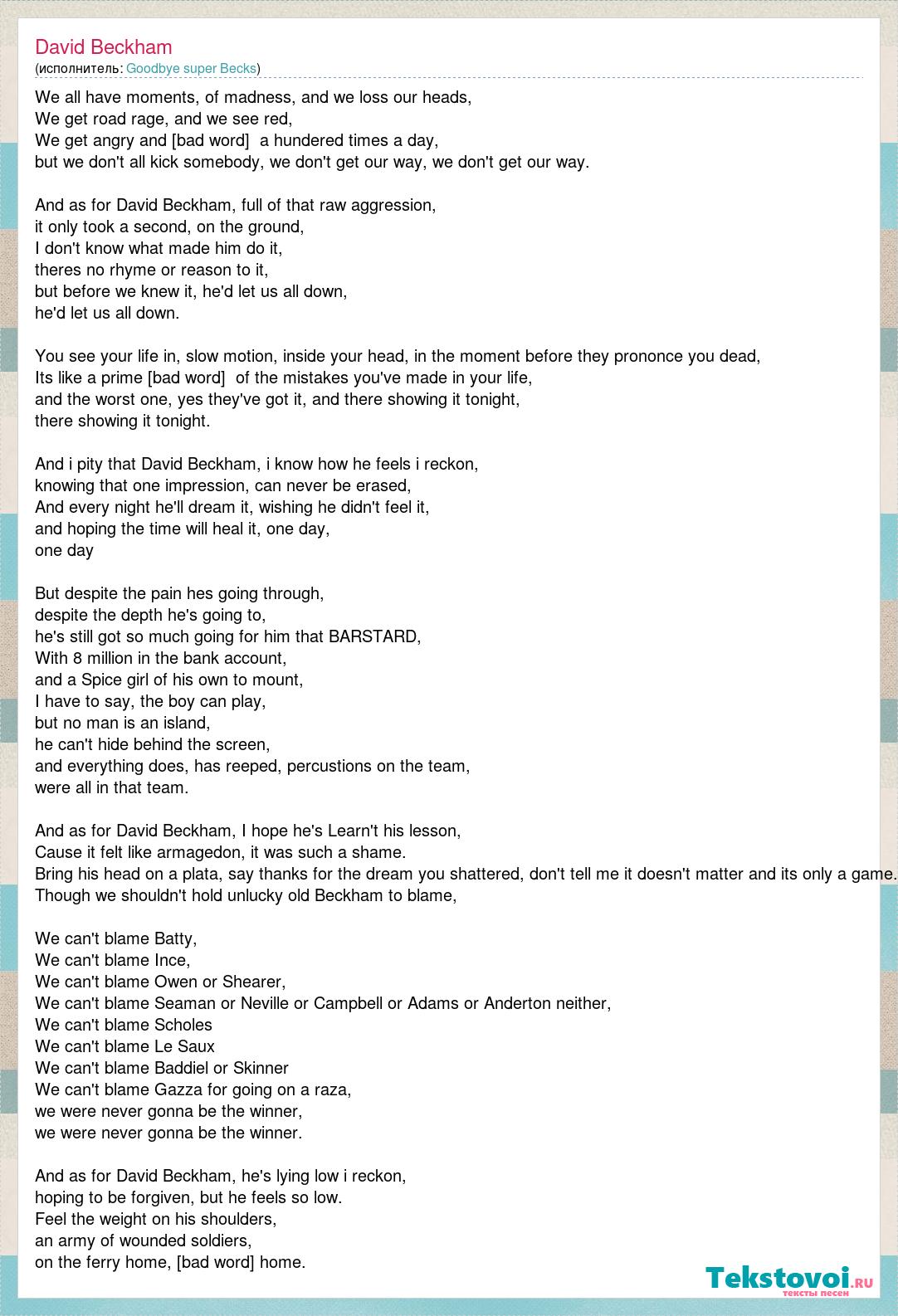 We all have moments, of madness, and we loss our heads, We get road rage, and we see red, We get angry and frustrated, a hundered times a day, but we don't all kick somebody, we don't get our way, we don't get our way. And as for David Beckham, full of that raw aggression, it only took a second, on the ground, I don't know what made him do it, theres no rhyme or reason to it, but before we knew it, he'd let us all down, he'd let us all down. You see your life in, slow motion, inside your head, in the moment before they prononce you dead, Its like a prime time compelation, of the mistakes you've made in your life, and the worst one, yes they've got it, and there showing it tonight, there showing it tonight. And i pity that David Beckham, i know how he feels i reckon, knowing that one impression, can never be erased, And every night he'll dream it, wishing he didn't feel it, and hoping the time will heal it, one day, one day But despite the pain hes going through, despite the depth he's going to, he's still got so much going for him that BARSTARD, With 8 million in the bank account, and a Spice girl of his own to mount, I have to say, the boy can play, but no man is an island, he can't hide behind the screen, and everything does, has reeped, percustions on the team, were all in that team. And as for David Beckham, I hope he's Learn't his lesson, Cause it felt like armagedon, it was such a shame. Bring his head on a plata, say thanks for the dream you shattered, don't tell me it doesn't matter and its only a game. Though we shouldn't hold unlucky old Beckham to blame, We can't blame Batty, We can't blame Ince, We can't blame Owen or Shearer, We can't blame Seaman or Neville or Campbell or Adams or Anderton neither, We can't blame Scholes We can't blame Le Saux We can't blame Baddiel or Skinner We can't blame Gazza for going on a raza, we were never gonna be the winner, we were never gonna be the winner. And as for David Beckham, he's lying low i reckon, hoping to be forgiven, but he feels so low. Feel the weight on his shoulders, an army of wounded soldiers, on the ferry home, were coming home.