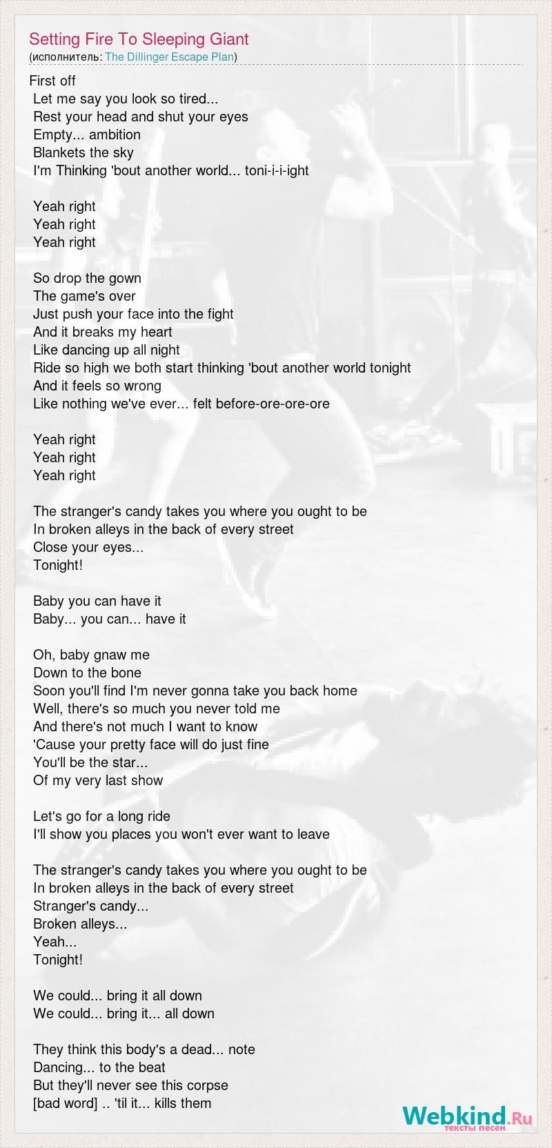 First off Let me say you look so tired... Rest your head and shut your eyes Empty... ambition Blankets the sky I'm Thinking 'bout another world... toni-i-i-ight Yeah right Yeah right Yeah right So drop the gown The game's over Just push your face into the fight And it breaks my heart Like dancing up all night Ride so high we both start thinking 'bout another world tonight And it feels so wrong Like nothing we've ever... felt before-ore-ore-ore Yeah right Yeah right Yeah right The stranger's candy takes you where you ought to be In broken alleys in the back of every street Close your eyes... Tonight! Baby you can have it Baby... you can... have it Oh, baby gnaw me Down to the bone Soon you'll find I'm never gonna take you back home Well, there's so much you never told me And there's not much I want to know 'Cause your pretty face will do just fine You'll be the star... Of my very last show Let's go for a long ride I'll show you places you won't ever want to leave The stranger's candy takes you where you ought to be In broken alleys in the back of every street Stranger's candy... Broken alleys... Yeah... Tonight! We could... bring it all down We could... bring it... all down They think this body's a dead... note Dancing... to the beat But they'll never see this corpse [bad word] .. 'til it... kills them