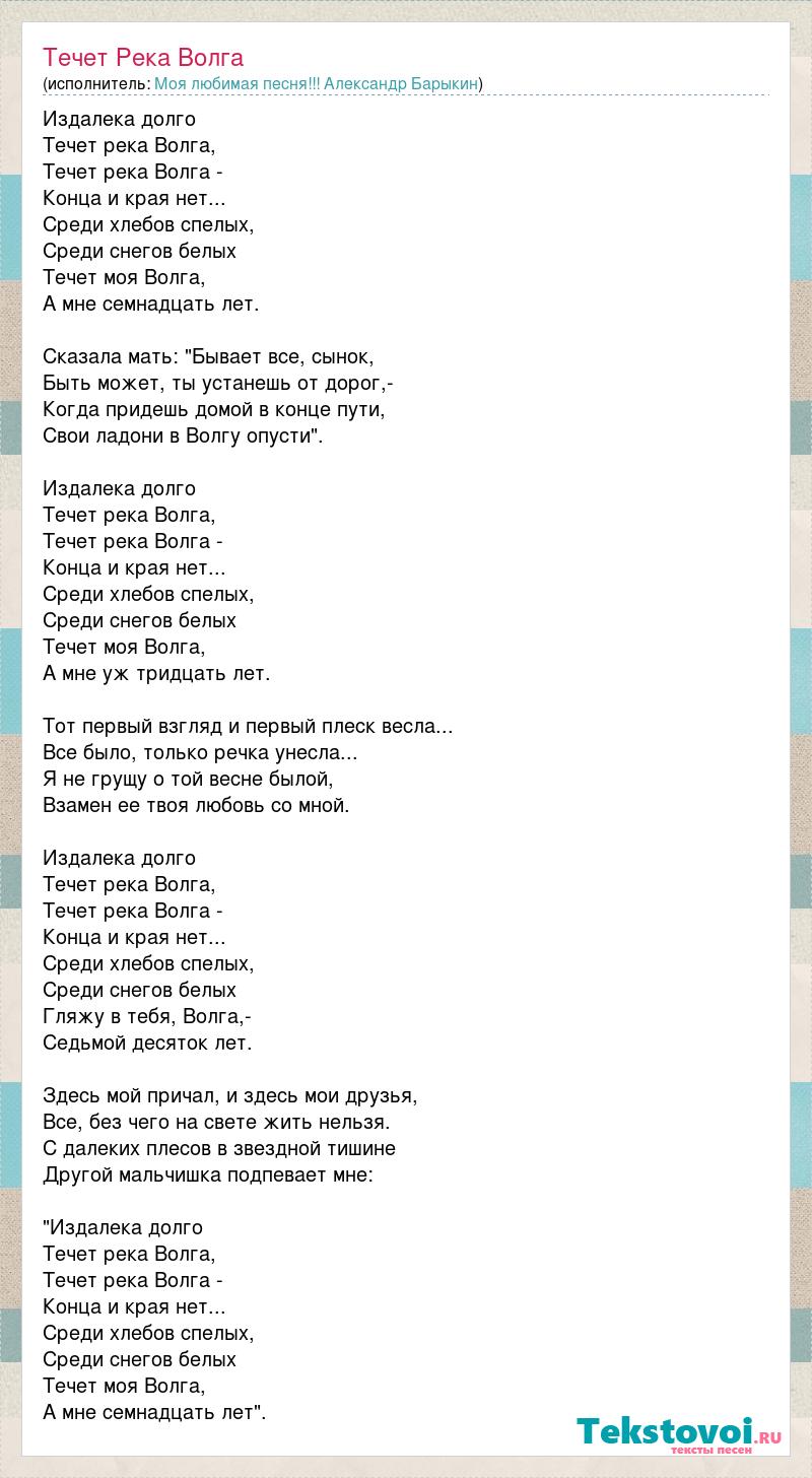 Издалека долго Течет река Волга, Течет река Волга - Конца и края нет... Среди хлебов спелых, Среди снегов белых Течет моя Волга, А мне семнадцать лет. Сказала мать: "Бывает все, сынок, Быть может, ты устанешь от дорог,- Когда придешь домой в конце пути, Свои ладони в Волгу опусти". Издалека долго Течет река Волга, Течет река Волга - Конца и края нет... Среди хлебов спелых, Среди снегов белых Течет моя Волга, А мне уж тридцать лет. Тот первый взгляд и первый плеск весла... Все было, только речка унесла... Я не грущу о той весне былой, Взамен ее твоя любовь со мной. Издалека долго Течет река Волга, Течет река Волга - Конца и края нет... Среди хлебов спелых, Среди снегов белых Гляжу в тебя, Волга,- Седьмой десяток лет. Здесь мой причал, и здесь мои друзья, Все, без чего на свете жить нельзя. С далеких плесов в звездной тишине Другой мальчишка подпевает мне: "Издалека долго Течет река Волга, Течет река Волга - Конца и края нет... Среди хлебов спелых, Среди снегов белых Течет моя Волга, А мне семнадцать лет".