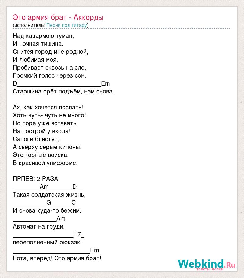 Над казармою туман, И ночная тишина. Снится город мне родной, И любимая моя. Пробивает сквозь на зло, Громкий голос через сон. D_________________________Em Старшина орёт подъём, нам снова. Ах, как хочется поспать! Хоть чуть- чуть не много! Но пора уже вставать На построй у входа! Сапоги блестят, А сверху серые кипоны. Это горные войска, В красивой униформе. ПРПЕВ: 2 РАЗА ________Am_______D__ Такая солдатская жизнь, __________G______C_ И снова куда-то бежим. _____________Am Автомат на груди, __________________H7_ переполненный рюкзак. _______________________Em Рота, вперёд! Это армия брат!