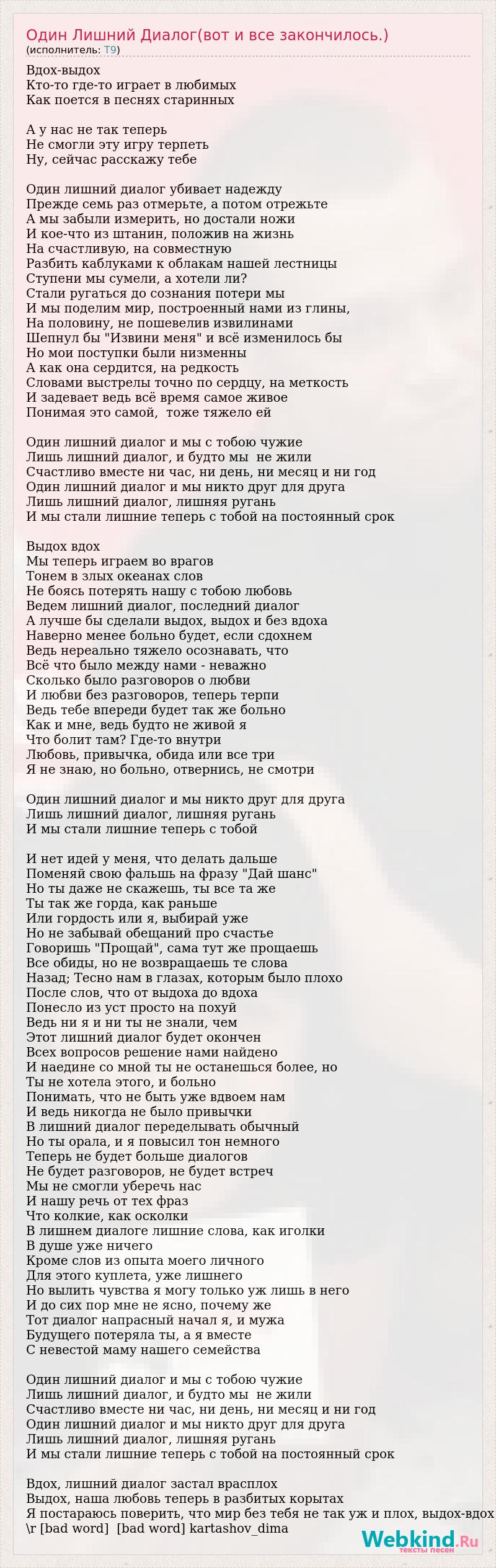 Вдох-выдох Кто-то где-то играет в любимых Как поется в песнях старинных А у нас не так теперь Не смогли эту игру терпеть Ну, сейчас расскажу тебе Один лишний диалог убивает надежду Прежде семь раз отмерьте, а потом отрежьте А мы забыли измерить, но достали ножи И кое-что из штанин, положив на жизнь На счастливую, на совместную Разбить каблуками к облакам нашей лестницы Ступени мы сумели, а хотели ли? Стали ругаться до сознания потери мы И мы поделим мир, построенный нами из глины, На половину, не пошевелив извилинами Шепнул бы "Извини меня" и всё изменилось бы Но мои поступки были низменны А как она сердится, на редкость Словами выстрелы точно по сердцу, на меткость И задевает ведь всё время самое живое Понимая это самой, тоже тяжело ей Один лишний диалог и мы с тобою чужие Лишь лишний диалог, и будто мы не жили Счастливо вместе ни час, ни день, ни месяц и ни год Один лишний диалог и мы никто друг для друга Лишь лишний диалог, лишняя ругань И мы стали лишние теперь с тобой на постоянный срок Выдох вдох Мы теперь играем во врагов Тонем в злых океанах слов Не боясь потерять нашу с тобою любовь Ведем лишний диалог, последний диалог А лучше бы сделали выдох, выдох и без вдоха Наверно менее больно будет, если сдохнем Ведь нереально тяжело осознавать, что Всё что было между нами - неважно Сколько было разговоров о любви И любви без разговоров, теперь терпи Ведь тебе впереди будет так же больно Как и мне, ведь будто не живой я Что болит там? Где-то внутри Любовь, привычка, обида или все три Я не знаю, но больно, отвернись, не смотри Один лишний диалог и мы никто друг для друга Лишь лишний диалог, лишняя ругань И мы стали лишние теперь с тобой И нет идей у меня, что делать дальше Поменяй свою фальшь на фразу "Дай шанс" Но ты даже не скажешь, ты все та же Ты так же горда, как раньше Или гордость или я, выбирай уже Но не забывай обещаний про счастье Говоришь "Прощай", сама тут же прощаешь Все обиды, но не возвращаешь те слова Назад; Тесно нам в глазах, которым было плохо После слов, что от выдоха до вдоха Понесло из уст просто на похуй Ведь ни я и ни ты не знали, чем Этот лишний диалог будет окончен Всех вопросов решение нами найдено И наедине со мной ты не останешься более, но Ты не хотела этого, и больно Понимать, что не быть уже вдвоем нам И ведь никогда не было привычки В лишний диалог переделывать обычный Но ты орала, и я повысил тон немного Теперь не будет больше диалогов Не будет разговоров, не будет встреч Мы не смогли уберечь нас И нашу речь от тех фраз Что колкие, как осколки В лишнем диалоге лишние слова, как иголки В душе уже ничего Кроме слов из опыта моего личного Для этого куплета, уже лишнего Но вылить чувства я могу только уж лишь в него И до сих пор мне не ясно, почему же Тот диалог напрасный начал я, и мужа Будущего потеряла ты, а я вместе С невестой маму нашего семейства Один лишний диалог и мы с тобою чужие Лишь лишний диалог, и будто мы не жили Счастливо вместе ни час, ни день, ни месяц и ни год Один лишний диалог и мы никто друг для друга Лишь лишний диалог, лишняя ругань И мы стали лишние теперь с тобой на постоянный срок Вдох, лишний диалог застал врасплох Выдох, наша любовь теперь в разбитых корытах Я постараюсь поверить, что мир без тебя не так уж и плох, выдох-вдох \r [bad word] [bad word] kartashov_dima