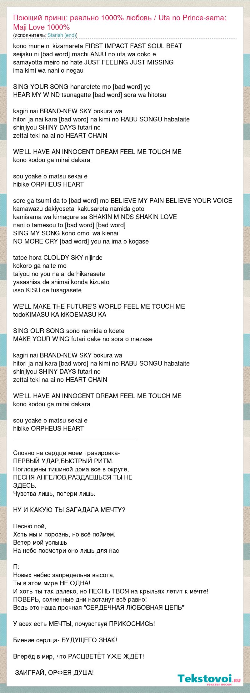 kono mune ni kizamareta FIRST IMPACT FAST SOUL BEAT seijaku ni yureru machi ANJU no uta wa doko e samayotta meiro no hate JUST FEELING JUST MISSING ima kimi wa nani o negau SING YOUR SONG hanaretete mo wakaru yo HEAR MY WIND tsunagatte iru sora wa hitotsu kagiri nai BRAND-NEW SKY bokura wa hitori ja nai kara haruka na kimi no RABU SONGU habataite shinjiyou SHINY DAYS futari no zettai teki na ai no HEART CHAIN WE'LL HAVE AN INNOCENT DREAM FEEL ME TOUCH ME kono kodou ga mirai dakara sou yoake o matsu sekai e hibike ORPHEUS HEART sore ga tsumi da to [bad word] mo BELIEVE MY PAIN BELIEVE YOUR VOICE kamawazu dakiyosetai kakusareta namida goto kamisama wa kimagure sa SHAKIN MINDS SHAKIN LOVE nani o tamesou to [bad word] iru SING MY SONG kono omoi wa kienai NO MORE CRY tagiru you na ima o kogase tatoe hora CLOUDY SKY nijinde kokoro ga naite mo taiyou no you na ai de hikarasete yasashisa de shimai konda kizuato isso KISU de fusagasete WE'LL MAKE THE FUTURE'S WORLD FEEL ME TOUCH ME todoKIMASU KA kiKOEMASU KA SING OUR SONG sono namida o koete MAKE YOUR WING futari dake no sora o mezase kagiri nai BRAND-NEW SKY bokura wa hitori ja nai kara haruka na kimi no RABU SONGU habataite shinjiyou SHINY DAYS futari no zettai teki na ai no HEART CHAIN WE'LL HAVE AN INNOCENT DREAM FEEL ME TOUCH ME kono kodou ga mirai dakara sou yoake o matsu sekai e hibike ORPHEUS HEART ____________________________________ Словно на сердце моем гравировка- ПЕРВЫЙ УДАР,БЫСТРЫЙ РИТМ. Поглощены тишиной дома все в округе, ПЕСНЯ АНГЕЛОВ,РАЗДАЕШЬСЯ ТЫ НЕ ЗДЕСЬ. Чувства лишь, потери лишь. НУ И КАКУЮ ТЫ ЗАГАДАЛА МЕЧТУ? Песню пой, Хоть мы и порознь, но всё поймем. Ветер мой услышь На небо посмотри оно лишь для нас П: Новых небес запредельна высота, Ты в этом мире НЕ ОДНА! И хоть ты так далеко, но ПЕСНЬ ТВОЯ на крыльях летит к мечте! ПОВЕРЬ, солнечные дни настанут всё равно! Ведь это наша прочная "СЕРДЕЧНАЯ ЛЮБОВНАЯ ЦЕПЬ" У всех есть МЕЧТЫ, почувствуй ПРИКОСНИСЬ! Биение сердца- БУДУЩЕГО ЗНАК! Вперёд в мир, что РАСЦВЕТЁТ УЖЕ ЖДЁТ! ЗАИГРАЙ, ОРФЕЯ ДУША!