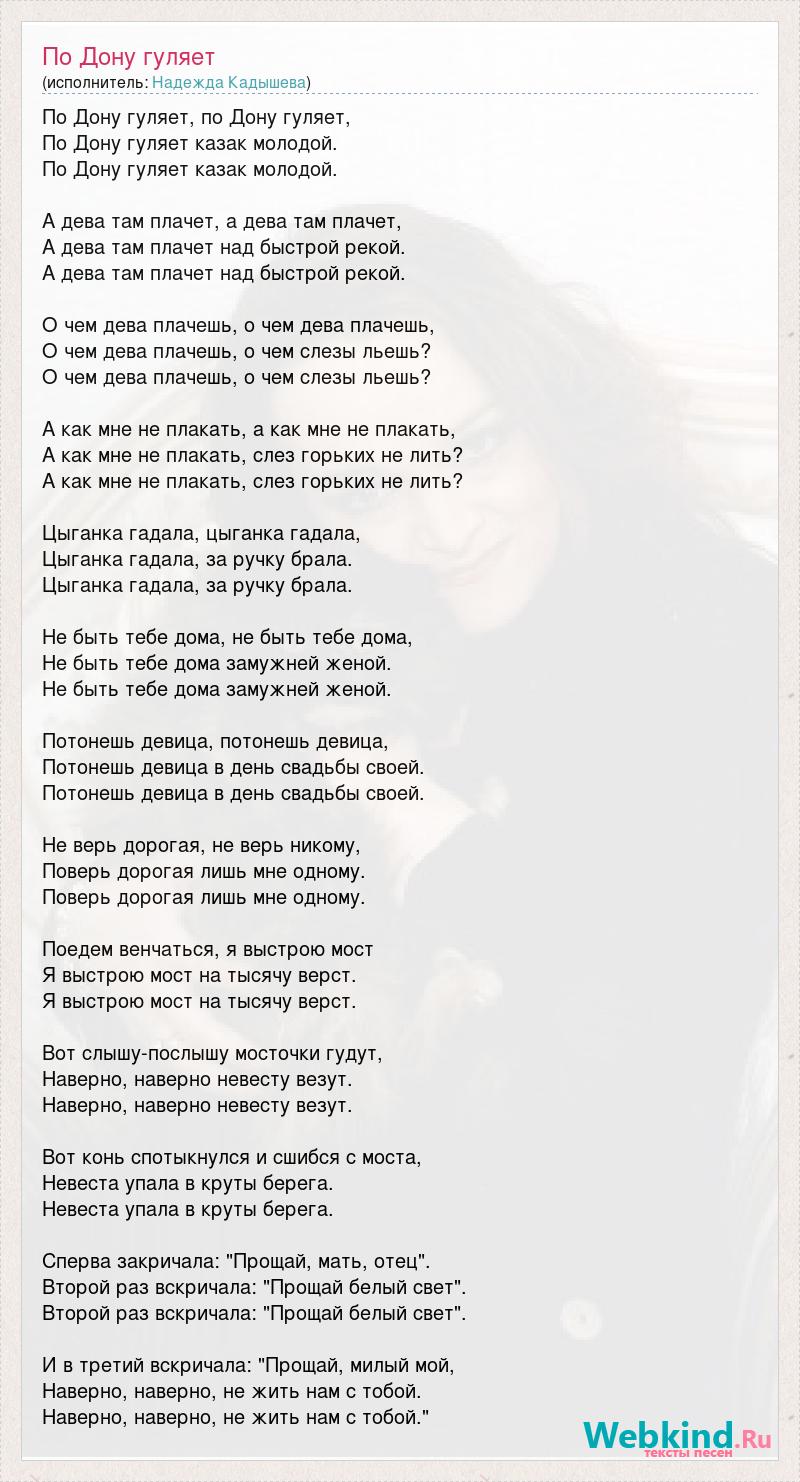 По Дону гуляет, по Дону гуляет, По Дону гуляет казак молодой. По Дону гуляет казак молодой. А дева там плачет, а дева там плачет, А дева там плачет над быстрой рекой. А дева там плачет над быстрой рекой. О чем дева плачешь, о чем дева плачешь, О чем дева плачешь, о чем слезы льешь? О чем дева плачешь, о чем слезы льешь? А как мне не плакать, а как мне не плакать, А как мне не плакать, слез горьких не лить? А как мне не плакать, слез горьких не лить? Цыганка гадала, цыганка гадала, Цыганка гадала, за ручку брала. Цыганка гадала, за ручку брала. Не быть тебе дома, не быть тебе дома, Не быть тебе дома замужней женой. Не быть тебе дома замужней женой. Потонешь девица, потонешь девица, Потонешь девица в день свадьбы своей. Потонешь девица в день свадьбы своей. Не верь дорогая, не верь никому, Поверь дорогая лишь мне одному. Поверь дорогая лишь мне одному. Поедем венчаться, я выстрою мост Я выстрою мост на тысячу верст. Я выстрою мост на тысячу верст. Вот слышу-послышу мосточки гудут, Наверно, наверно невесту везут. Наверно, наверно невесту везут. Вот конь спотыкнулся и сшибся с моста, Невеста упала в круты берега. Невеста упала в круты берега. Сперва закричала: "Прощай, мать, отец". Второй раз вскричала: "Прощай белый свет". Второй раз вскричала: "Прощай белый свет". И в третий вскричала: "Прощай, милый мой, Наверно, наверно, не жить нам с тобой. Наверно, наверно, не жить нам с тобой."