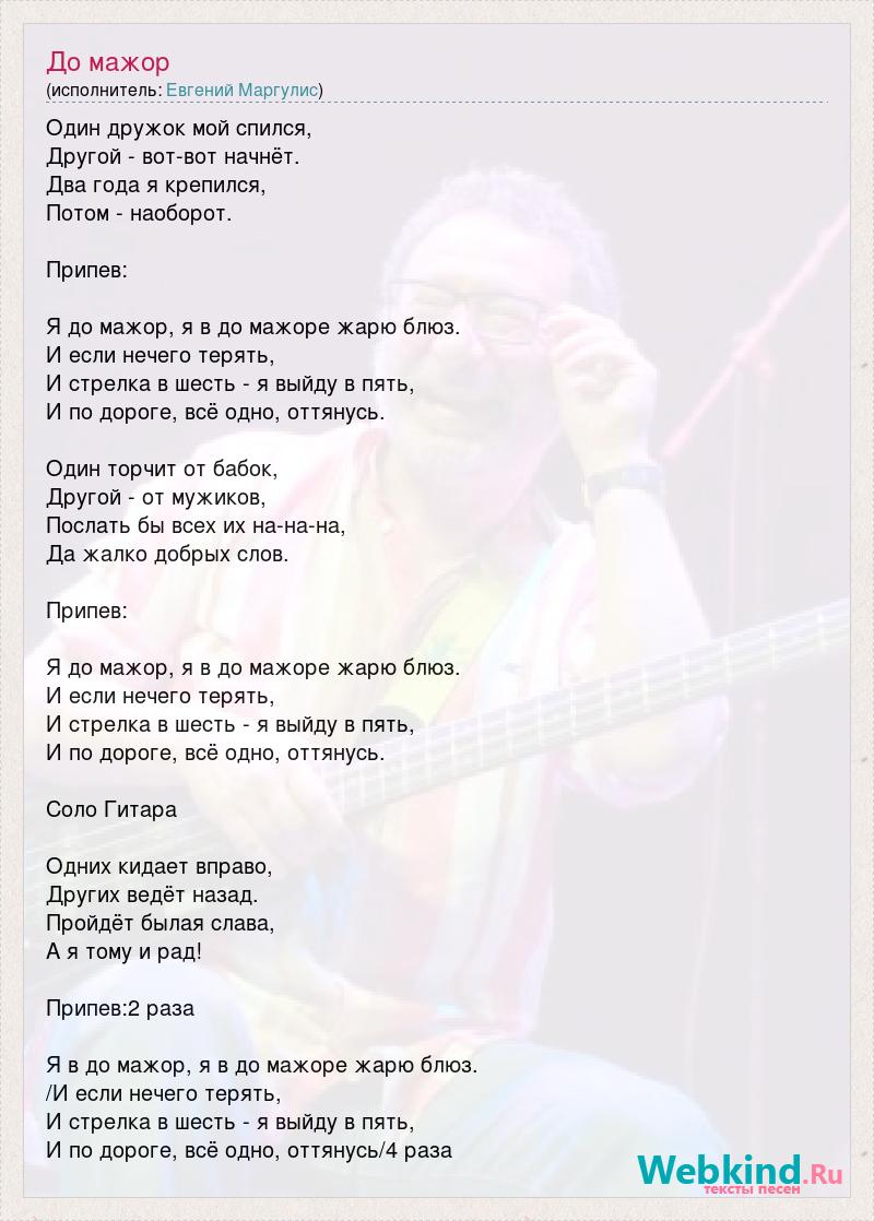 Один дружок мой спился, Другой - вот-вот начнёт. Два года я крепился, Потом - наоборот. Припев: Я до мажор, я в до мажоре жарю блюз. И если нечего терять, И стрелка в шесть - я выйду в пять, И по дороге, всё одно, оттянусь. Один торчит от бабок, Другой - от мужиков, Послать бы всех их на-на-на, Да жалко добрых слов. Припев: Я до мажор, я в до мажоре жарю блюз. И если нечего терять, И стрелка в шесть - я выйду в пять, И по дороге, всё одно, оттянусь. Соло Гитара Одних кидает вправо, Других ведёт назад. Пройдёт былая слава, А я тому и рад! Припев:2 раза Я в до мажор, я в до мажоре жарю блюз. /И если нечего терять, И стрелка в шесть - я выйду в пять, И по дороге, всё одно, оттянусь/4 раза