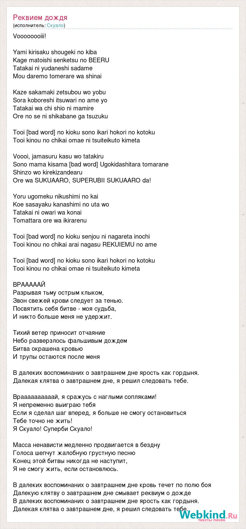 Voooooooiii! Yami kirisaku shougeki no kiba Kage matoishi senketsu no BEERU Tatakai ni yudaneshi sadame Mou daremo tomerare wa shinai Kaze sakamaki zetsubou wo yobu Sora koboreshi itsuwari no ame yo Tatakai wa chi shio ni mamire Ore no se ni shikabane ga tsuzuku Tooi [bad word] no kioku sono ikari hokori no kotoku Tooi kinou no chikai omae ni tsuiteikuto kimeta Voooi, jamasuru kasu wo tatakiru Sono mama kisama [bad word] Ugokidashitara tomarane Shinzo wo kirekizandearu Ore wa SUKUAARO, SUPERUBII SUKUAARO da! Yoru ugomeku nikushimi no kai Koe sasayaku kanashimi no uta wo Tatakai ni owari wa konai Tomattara ore wa ikirarenu Tooi [bad word] no kioku senjou ni nagareta inochi Tooi kinou no chikai arai nagasu REKUIEMU no ame Tooi [bad word] no kioku sono ikari hokori no kotoku Tooi kinou no chikai omae ni tsuiteikuto kimeta ВРАААААЙ Разрывая тьму острым клыком, Звон свежей крови следует за тенью. Посвятить себя битве - моя судьба, И никто больше меня не удержит. Тихий ветер приносит отчаяние Небо разверзлось фальшивым дождем Битва окрашена кровью И трупы остаются после меня В далеких воспоминаних о завтрашнем дне ярость как гордыня. Далекая клятва о завтрашнем дне, я решил следовать тебе. Враааааааааай, я сражусь с наглыми сопляками! Я непременно выиграю тебя Если я сделал шаг вперед, я больше не смогу остановиться Тебе точно не жить! Я Скуало! Суперби Скуало! Масса ненависти медленно продвигается в бездну Голоса шепчут жалобную грустную песню Конец этой битвы никогда не наступит, Я не смогу жить, если остановлюсь. В далеких воспоминаних о завтрашнем дне кровь течет по полю боя Далекую клятву о завтрашнем дне смывает реквиум о дожде В далеких воспоминаних о завтрашнем дне ярость как гордыня. Далекая клятва о завтрашнем дне, я решил следовать тебе.