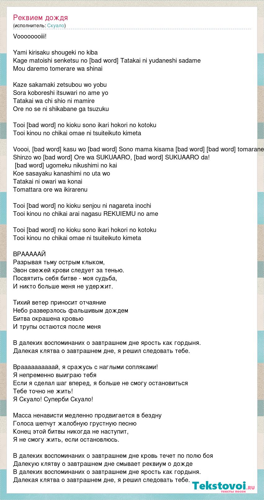 Voooooooiii! Yami kirisaku shougeki no kiba Kage matoishi senketsu no BEERU Tatakai ni yudaneshi sadame Mou daremo tomerare wa shinai Kaze sakamaki zetsubou wo yobu Sora koboreshi itsuwari no ame yo Tatakai wa chi shio ni mamire Ore no se ni shikabane ga tsuzuku Tooi [bad word] no kioku sono ikari hokori no kotoku Tooi kinou no chikai omae ni tsuiteikuto kimeta Voooi, jamasuru kasu wo tatakiru Sono mama kisama [bad word] Ugokidashitara tomarane Shinzo wo kirekizandearu Ore wa SUKUAARO, SUPERUBII SUKUAARO da! Yoru ugomeku nikushimi no kai Koe sasayaku kanashimi no uta wo Tatakai ni owari wa konai Tomattara ore wa ikirarenu Tooi [bad word] no kioku senjou ni nagareta inochi Tooi kinou no chikai arai nagasu REKUIEMU no ame Tooi [bad word] no kioku sono ikari hokori no kotoku Tooi kinou no chikai omae ni tsuiteikuto kimeta ВРАААААЙ Разрывая тьму острым клыком, Звон свежей крови следует за тенью. Посвятить себя битве - моя судьба, И никто больше меня не удержит. Тихий ветер приносит отчаяние Небо разверзлось фальшивым дождем Битва окрашена кровью И трупы остаются после меня В далеких воспоминаних о завтрашнем дне ярость как гордыня. Далекая клятва о завтрашнем дне, я решил следовать тебе. Враааааааааай, я сражусь с наглыми сопляками! Я непременно выиграю тебя Если я сделал шаг вперед, я больше не смогу остановиться Тебе точно не жить! Я Скуало! Суперби Скуало! Масса ненависти медленно продвигается в бездну Голоса шепчут жалобную грустную песню Конец этой битвы никогда не наступит, Я не смогу жить, если остановлюсь. В далеких воспоминаних о завтрашнем дне кровь течет по полю боя Далекую клятву о завтрашнем дне смывает реквиум о дожде В далеких воспоминаних о завтрашнем дне ярость как гордыня. Далекая клятва о завтрашнем дне, я решил следовать тебе.