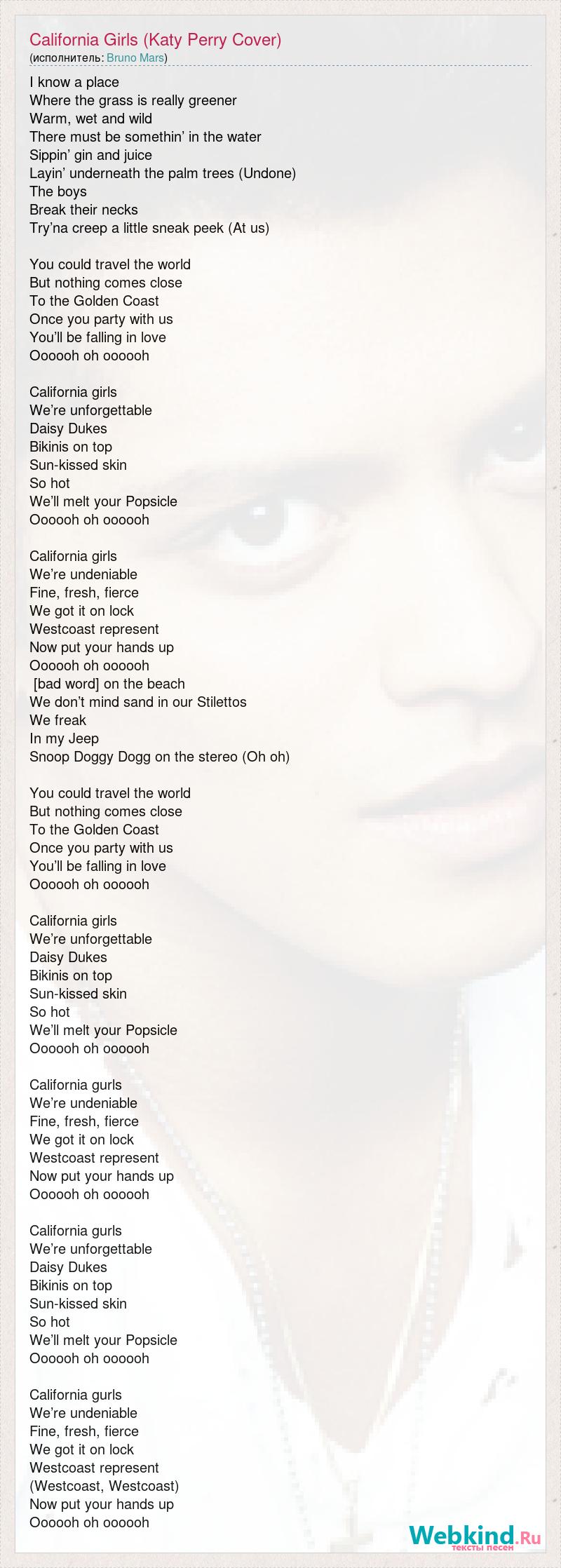 I know a place Where the grass is really greener Warm, wet and wild There must be somethin’ in the water Sippin’ gin and juice Layin’ underneath the palm trees (Undone) The boys Break their necks Try’na creep a little sneak peek (At us) You could travel the world But nothing comes close To the Golden Coast Once you party with us You’ll be falling in love Oooooh oh oooooh California girls We’re unforgettable Daisy Dukes Bikinis on top Sun-kissed skin So hot We’ll melt your Popsicle Oooooh oh oooooh California girls We’re undeniable Fine, fresh, fierce We got it on lock Westcoast represent Now put your hands up Oooooh oh oooooh [bad word] on the beach We don’t mind sand in our Stilettos We freak In my Jeep Snoop Doggy Dogg on the stereo (Oh oh) You could travel the world But nothing comes close To the Golden Coast Once you party with us You’ll be falling in love Oooooh oh oooooh California girls We’re unforgettable Daisy Dukes Bikinis on top Sun-kissed skin So hot We’ll melt your Popsicle Oooooh oh oooooh California gurls We’re undeniable Fine, fresh, fierce We got it on lock Westcoast represent Now put your hands up Oooooh oh oooooh California gurls We’re unforgettable Daisy Dukes Bikinis on top Sun-kissed skin So hot We’ll melt your Popsicle Oooooh oh oooooh California gurls We’re undeniable Fine, fresh, fierce We got it on lock Westcoast represent (Westcoast, Westcoast) Now put your hands up Oooooh oh oooooh