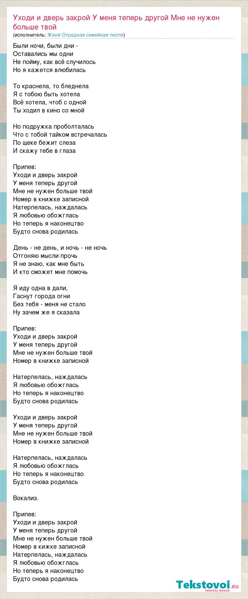 Были ночи, были дни - Оставались мы одни Не пойму, как всё случилось Но я кажется влюбилась То краснела, то бледнела Я с тобою быть хотела Всё хотела, чтоб с одной Ты ходил в кино со мной Но подружка проболталась Что с тобой тайком встречалась По щеке бежит слеза И скажу тебе в глаза Припев: Уходи и дверь закрой У меня теперь другой Мне не нужен больше твой Номер в книжке записной Натерпелась, наждалась Я любовью обожглась Но теперь я наконецтво Будто снова родилась День - не день, и ночь - не ночь Отгоняю мысли прочь Я не знаю, как мне быть И кто сможет мне помочь Я иду одна в дали, Гаснут города огни Без тебя - меня не стало Ну зачем же я сказала Припев: Уходи и дверь закрой У меня теперь другой Мне не нужен больше твой Номер в книжке записной Натерпелась, наждалась Я любовью обожглась Но теперь я наконецтво Будто снова родилась Уходи и дверь закрой У меня теперь другой Мне не нужен больше твой Номер в книжке записной Натерпелась, наждалась Я любовью обожглась Но теперь я наконецтво Будто снова родилась Вокализ. Припев: Уходи и дверь закрой У меня теперь другой Мне не нужен больше твой Номер в кижке записной Натерпелась, наждалась Я любовью обожглась Но теперь я наконецтво Будто снова родилась